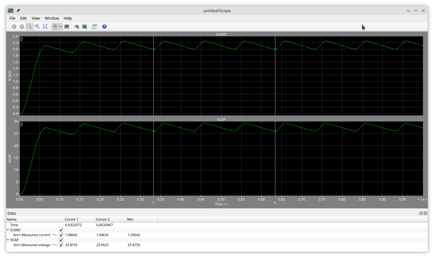 24V çıkış için 4400 uF biraz marjinal oluyor. 2A çekilirken minimum voltaj 25.87. Bunun en az 26 V olmasını istiyoruz, yani istenen DC çıkış 24 + 2.