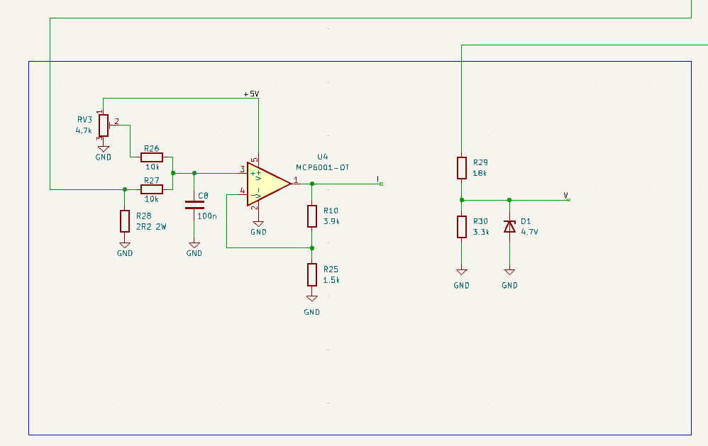 Voltaj kısmında opamp'e gerek yok. 30V u bölüyoruz uygun bir şekilde, sonra da voltajı 4.7V ile sınırlandırıp MCU ya veriyoruz.