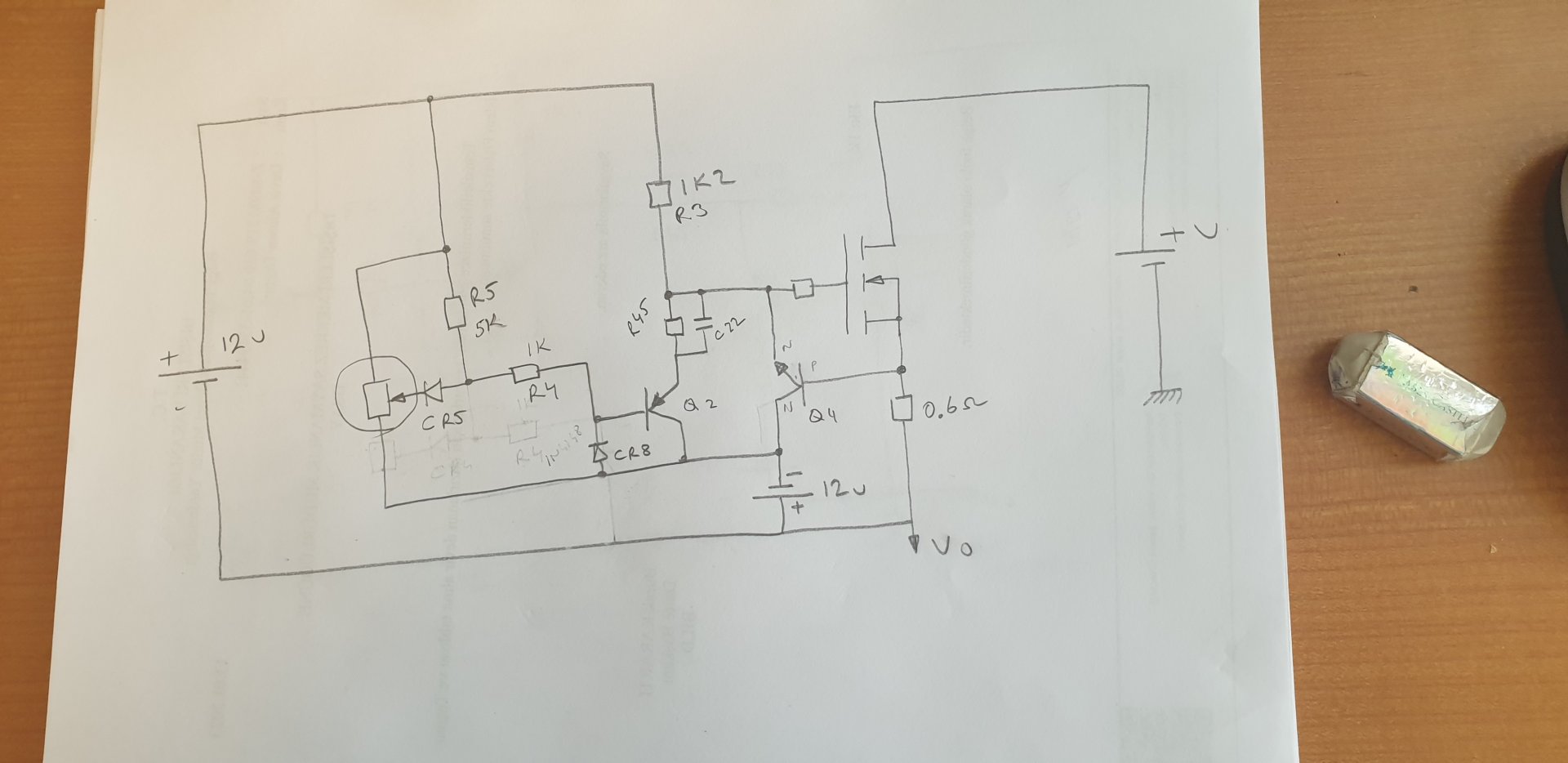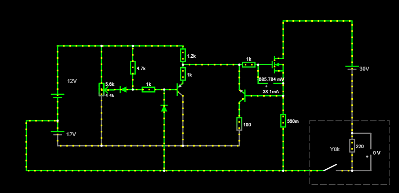 Guc katini suren Q2 transistoru. CR5'in bagli oldugu ve trimpot olarak gosterdigim kisimla aslinda kafa karistirmamak icin hata amplifikatoru olan U1 opampini modelledim.
