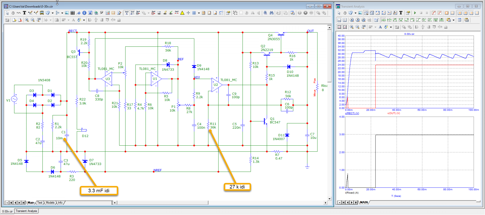 Ripple olayını simulatör seviyesinde çözdüm. Filtre kapasitörünü 3.3 mF dan 10 mF a çıkardım. Bir de voltaj regülasyonu yapan U2 nin kazancını biraz düşürdüm. Şu anda 24 VAC veriyorum ve 24 VDC çıkış alabiliyorum. Akım değeri de 3 A. Yarın da bunu gerçek devrede deneyeceğim.
