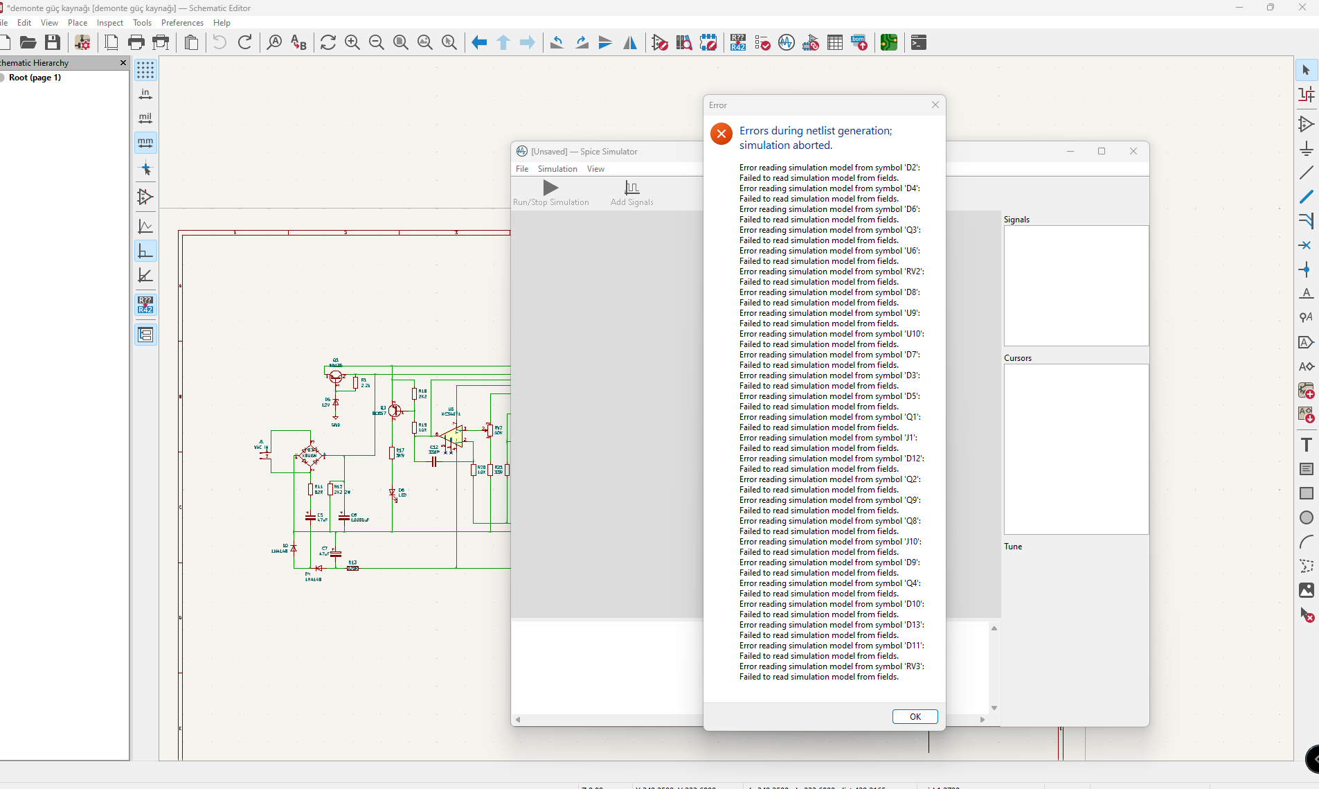 Ben daha önce kicad de simulatör hiç kullanmadım. Muhtemelen simulatör kullanmak için belirli elemanları seçmek gerekiyordur. Yüzlerce eleman var. Hepsini simule edemeyebilir kicad.