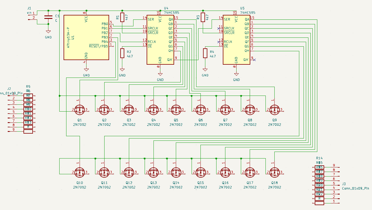 Burada iki 74HC595 arasındaki bağlantıyı doğru yapmış mıyım? PJC7404 mosfet KiCad de olmadığı için salladım.