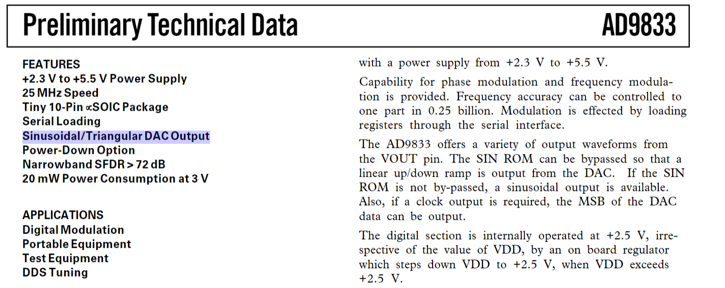 AD9833 bir sinyal jeneratörü zaten, işi analog voltaj çıkarmak. Sinyali içeride dijital olarak sentezleyip bir DAC ile analoga dönüştürüyor.