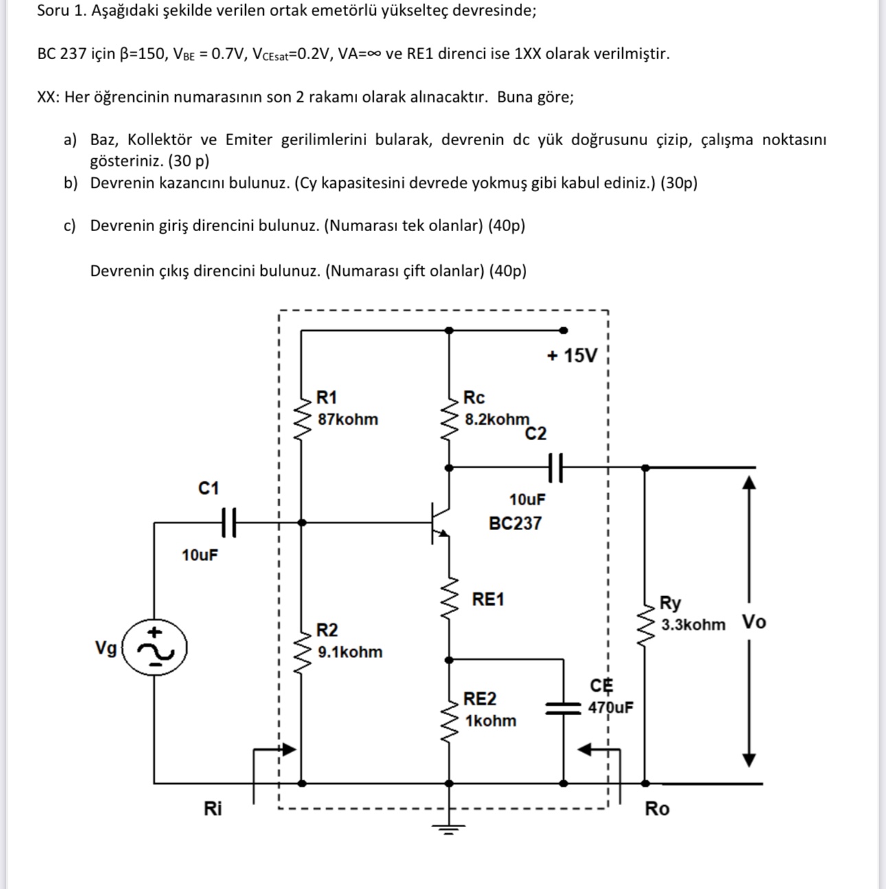 Yapma lütfen nasıl biraz zor geldi, devre en temel komponentlerden oluşuyor ve tek aşamalı. Zaten olabilecek en basite indirgenmiş sadece sayılardan ötürü değerler çirkin çıkabilir. Rastgele bir örnek bul common emitter w/degeneration için zaten çözümü bulmuş olursun. Bize bir şeyler ver ki bizde yardım edelim, buyur soru burda çöz diyince heves gelmedi.