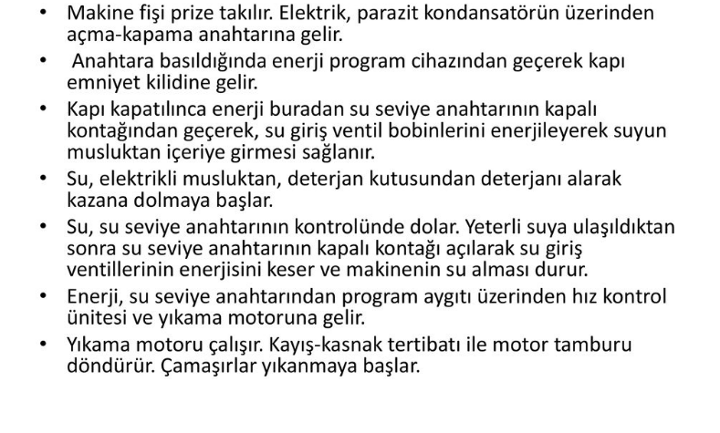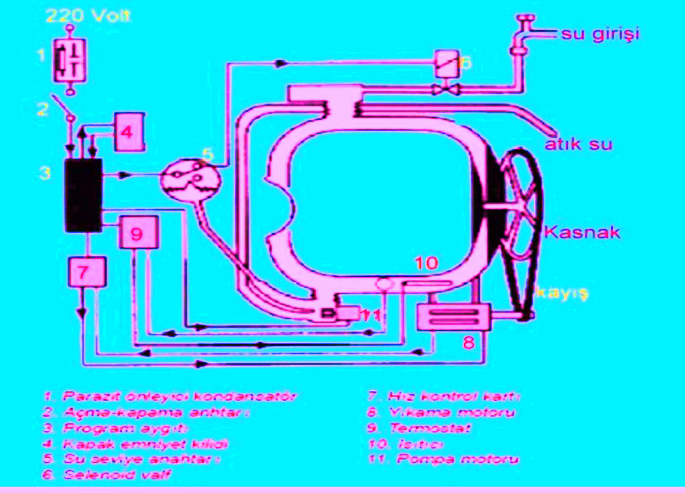 Makinanın çalışma sırası ve blok şemasından yararlanabilirsin, buna göre ilk önce kapı kilidini ve su ventilini çalıştırman lazım.