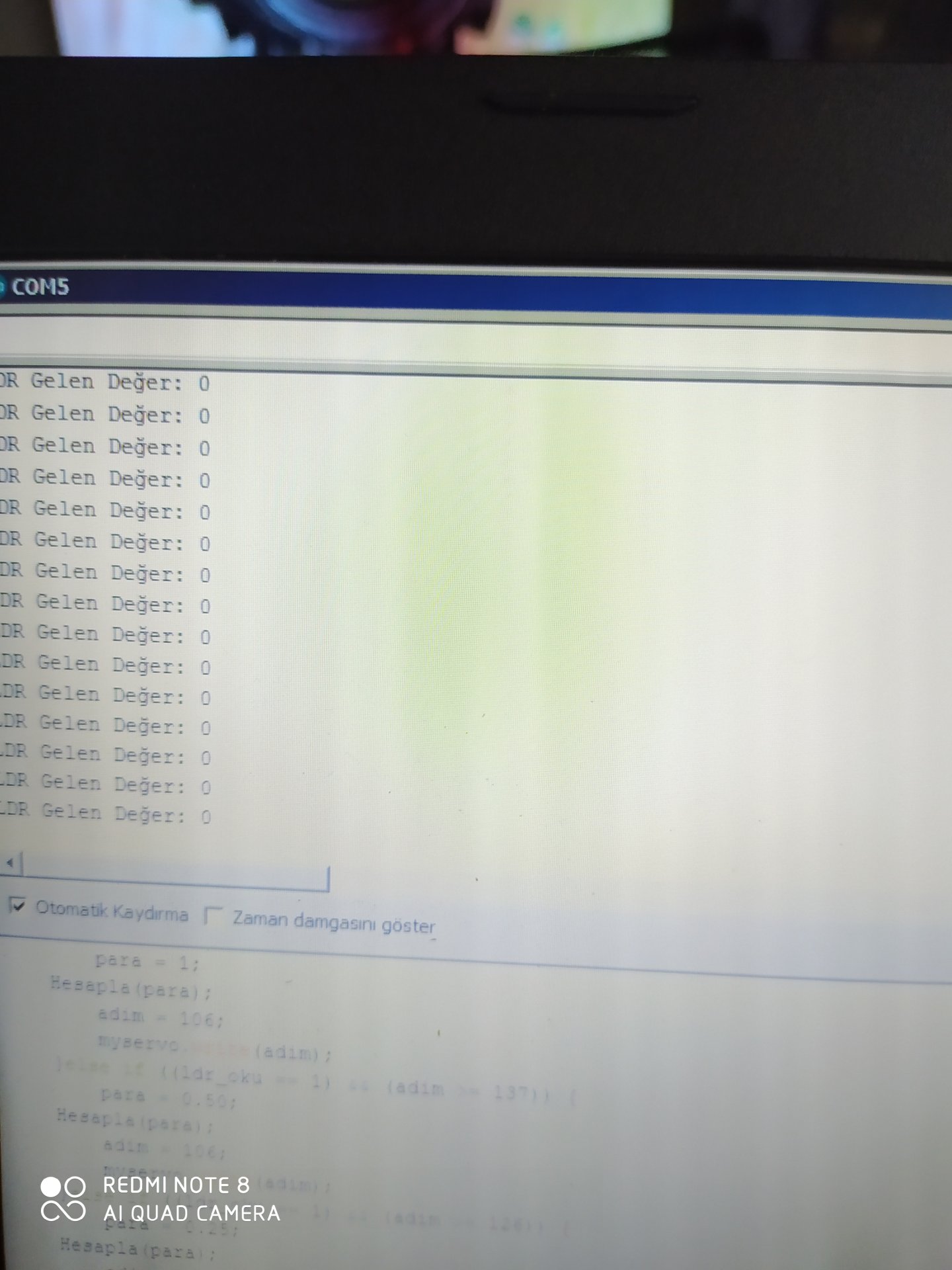 Sistemi çalıştır ve serial monitörü takip et bakalım LDR den veri geliyor mu?