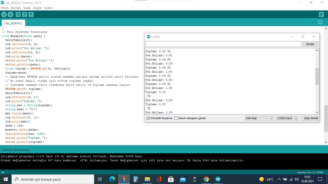 Abi ldr den 30 -ila 900 arası analog okuma yapabiliyorum. Bunu da map komutu ile 0-1 durumuna yuvarlıyorum. Sadece 2 rakam. Bu durumda para ldr yi kapatıyorsa 0'ı kullanıyorum, kapatmıyorsa 1'i kullanıyorum. Paraları asıl servo sayesinde tanımlıyorum. Para düşene kadar servo 1'er derece aralıklarla ilerliyor. Mesela 1tl 146.adım da düşüyor aşağı. Bende eğer servo 146 ya eşitse 1 tl olarak tanımlıyorum. Diğer paralarda sırasıyla 137,126,119 ve 115. Adımlarda düşüyor. En çok korktuğum 5krş ile 10krş arasında servoda 4 adım fark ediyor.