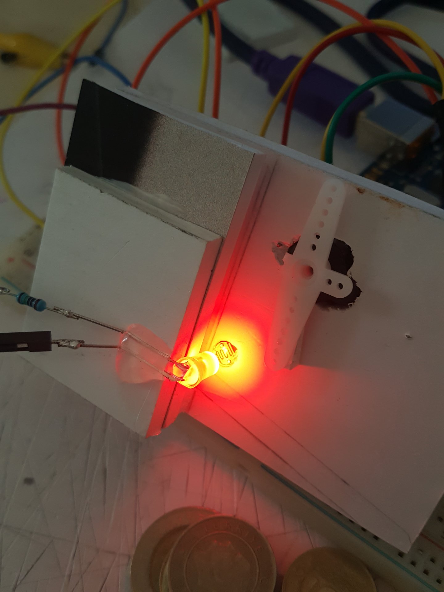 Para düşüyor, LDR nin önü açılıyor ve servo adım saymayı kesiyor.