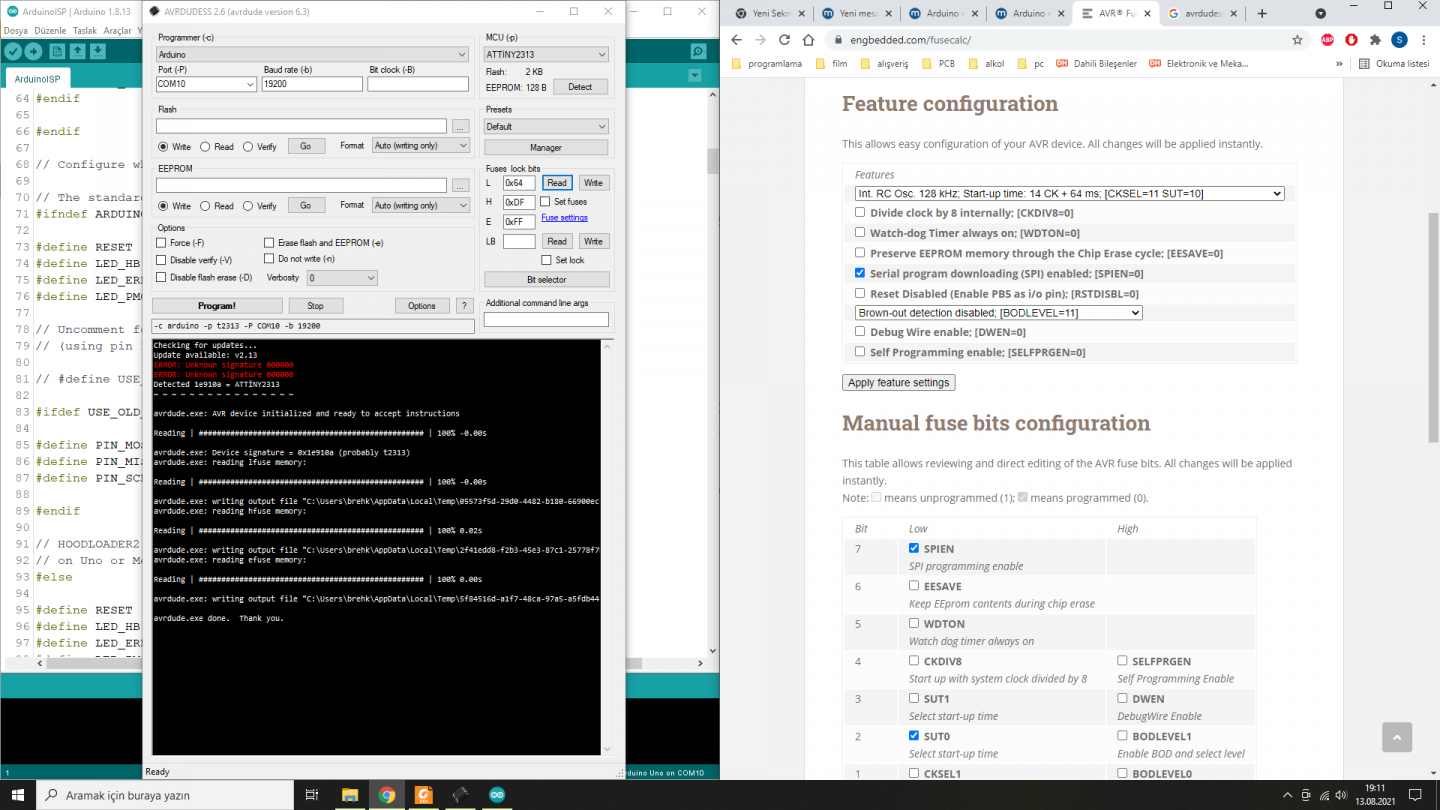 GUI avr programlayıcı için avrdudess ekte. 19200 baudrate ayarlayınca arduino as isp kullanarak fusebit'leri de ayarlayabiliyor.