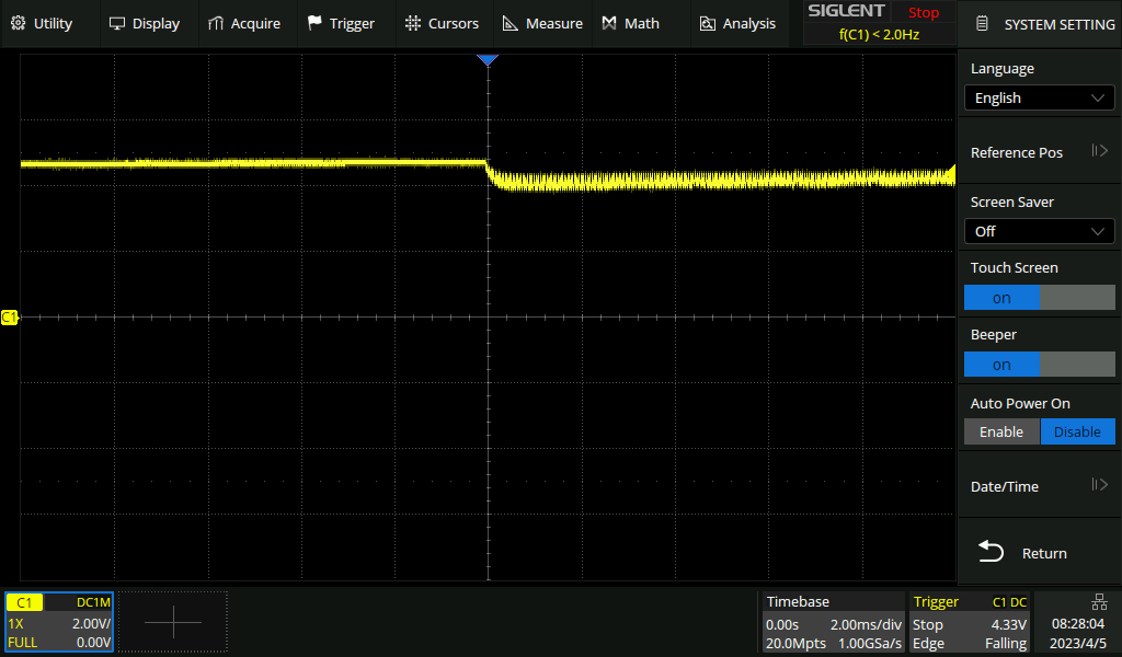 Mikrodenetleyici ile özellikle etrafta paraztin oluşturabilecek motor, selenoid vb unsurlar varken voltajların temiz olduğundan her zaman emin olmak gerekiyor. Bende bu yüzden öncelikle voltajdan emin olmak istedim. Bunun için ise osiloskopun trigerini düşüşü yakalaması için kurdum.