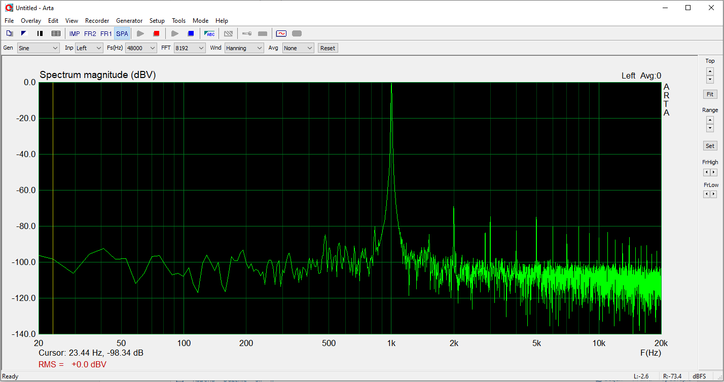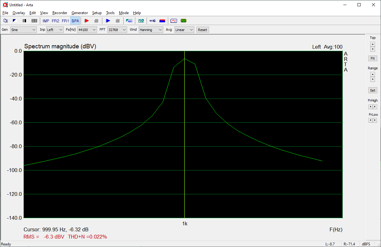 Kürsördeki değer -6.020 dBV. Buradaki FFT nokta sayısı 32k, Window flat top, geçmişe dönük 4 ortalama alıyor.