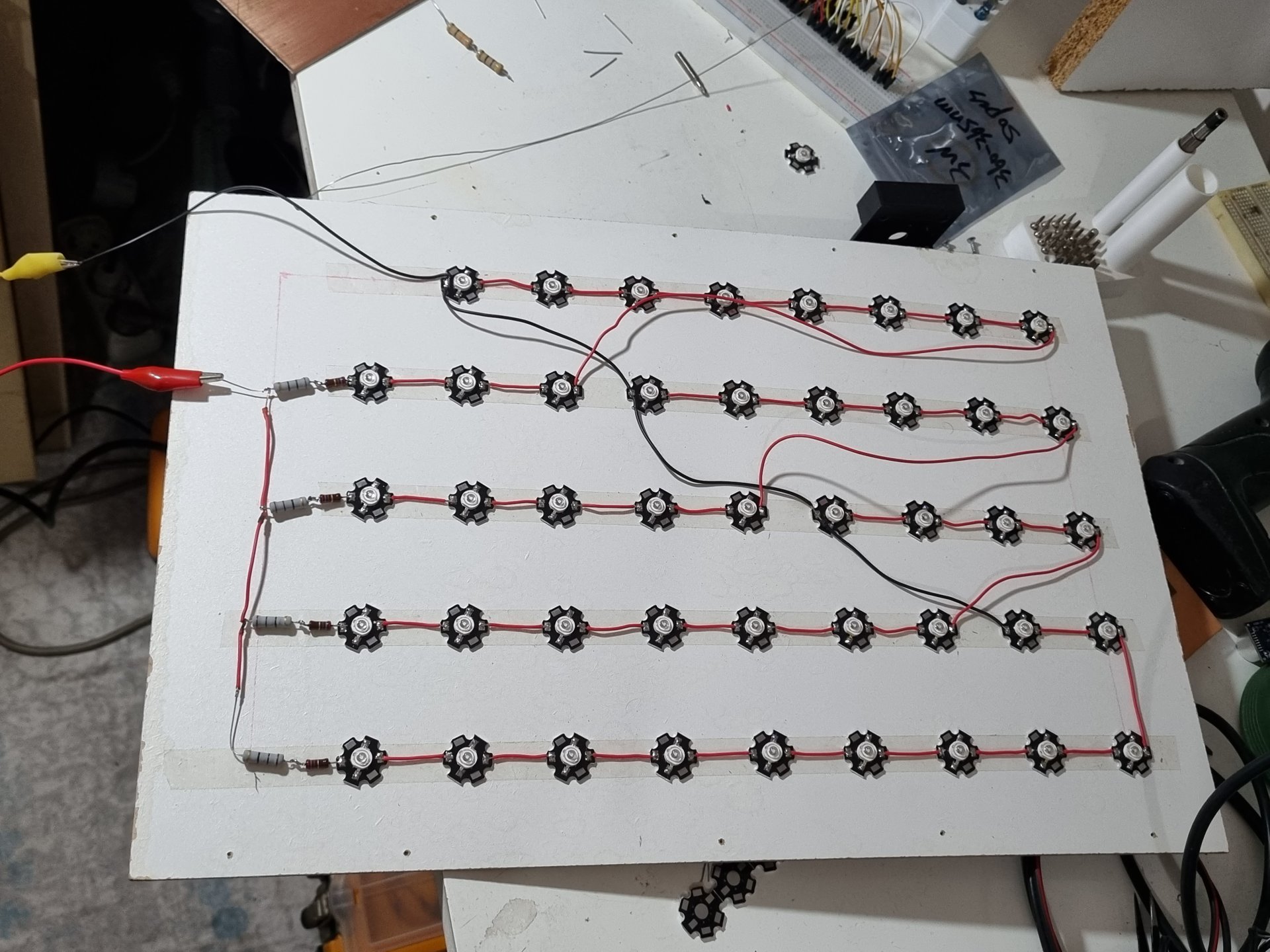 Ben yine bir hata yaptım galiba. Led başına 50mA çekmem gerekiyordu. 11 Seri 4 paralel bağladım. Her serinin başına 278ohm direnç koydum. Toplam akımı ölçtüğümde 200mA çıkıyor.