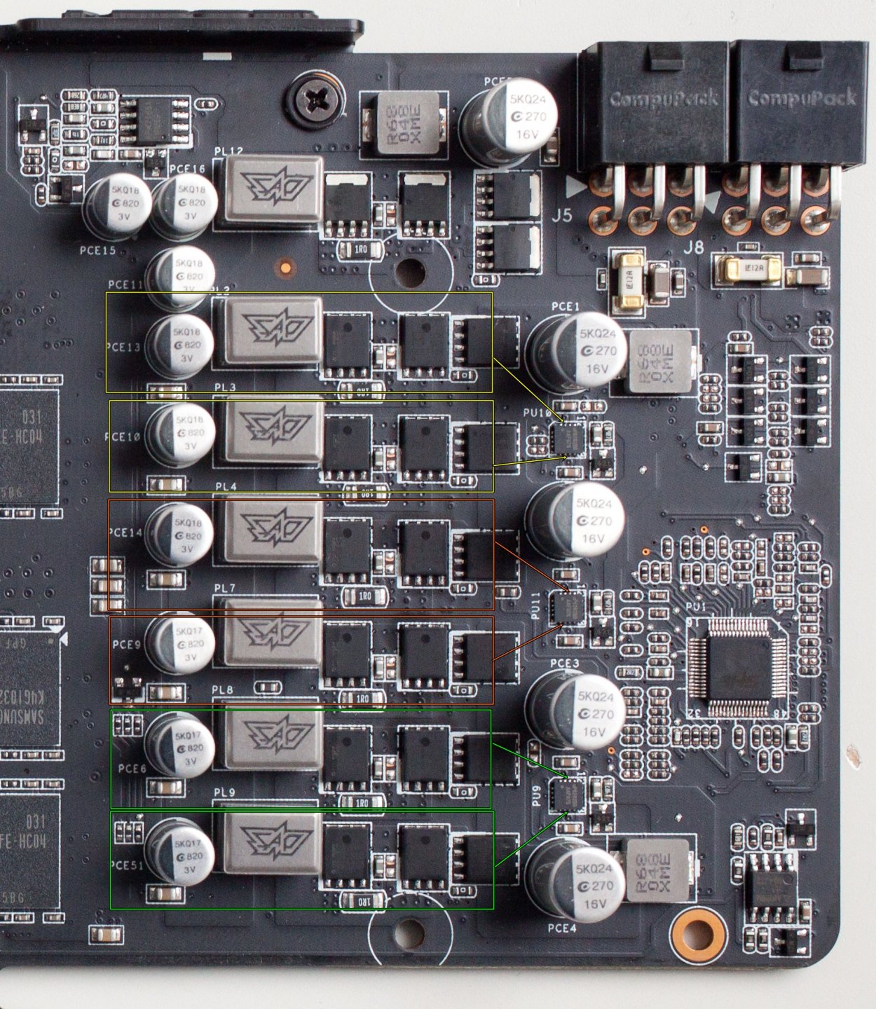 Aşağıda belirtmeye çalıştığım alanların tüm bağlantıları kısa devre gösteriyor (mosfetlerin gateleri hariç). Kapasitörler, regülatörler low mosfetler ve başlarındaki 1 high mosfetlerin low kısımları. Sonra kartın soluna doğru devam ettiğimde kısa devrenin devam ettiği yerler bulabiliyorum farklı farklı. Sağ üstteki 12v girişten itibaren ölçerek güç yolunu takip ettiğimde bir şey çıkmıyor. 40 bacaklı controllera geliyorum, onun da data sheetini ne yaptıysam bulamadım. Bulsamda, o 40 bacaklı SHE ASP0907 (uP6218 rebranded) daha küçük kare şekilde gözüken 3 tane pwm controllera bağlı. O 3 pwm controllerın da sadece hali hazırda kısadevre veren işaretli ayakları kısa devre gösteriyor.