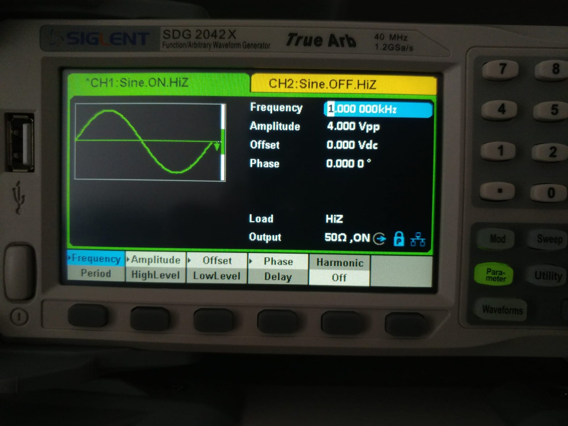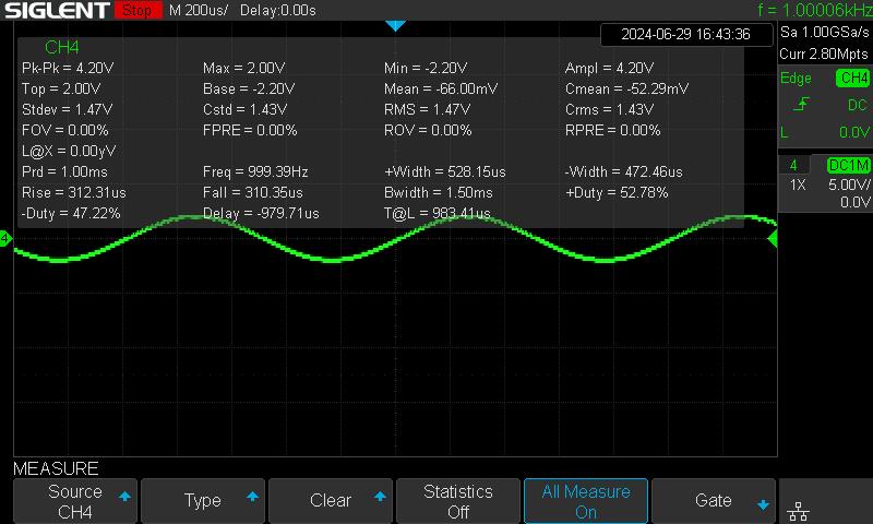 AWG 4.000 Vpp ve 1 kHz, skop 1V ayarlı.