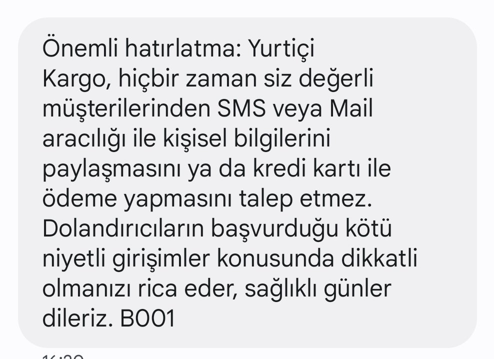 Banada aynı uyarı geldi ama sorun şu ki gelen spam mesajda "yurtiçi kargo" yazmasına karşın yönlendirdiği site "ptt"