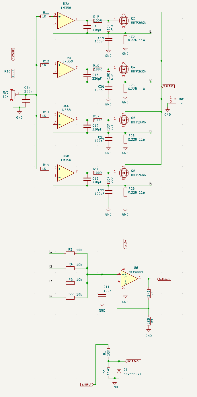 4 şöntten voltajı alıp toplayıcı opamp'e veriyoruz. Aslında çıkışın tam olarak toplama eşit olması için opamp kazancının tam 4 olması lazım. Ama o kombinasyonu standart dirençlerle yakalamak için kendini paralayacağına, ADC ile okuduğun değeri bir düzeltme katsayısı ile çarpman yeterli olacak.