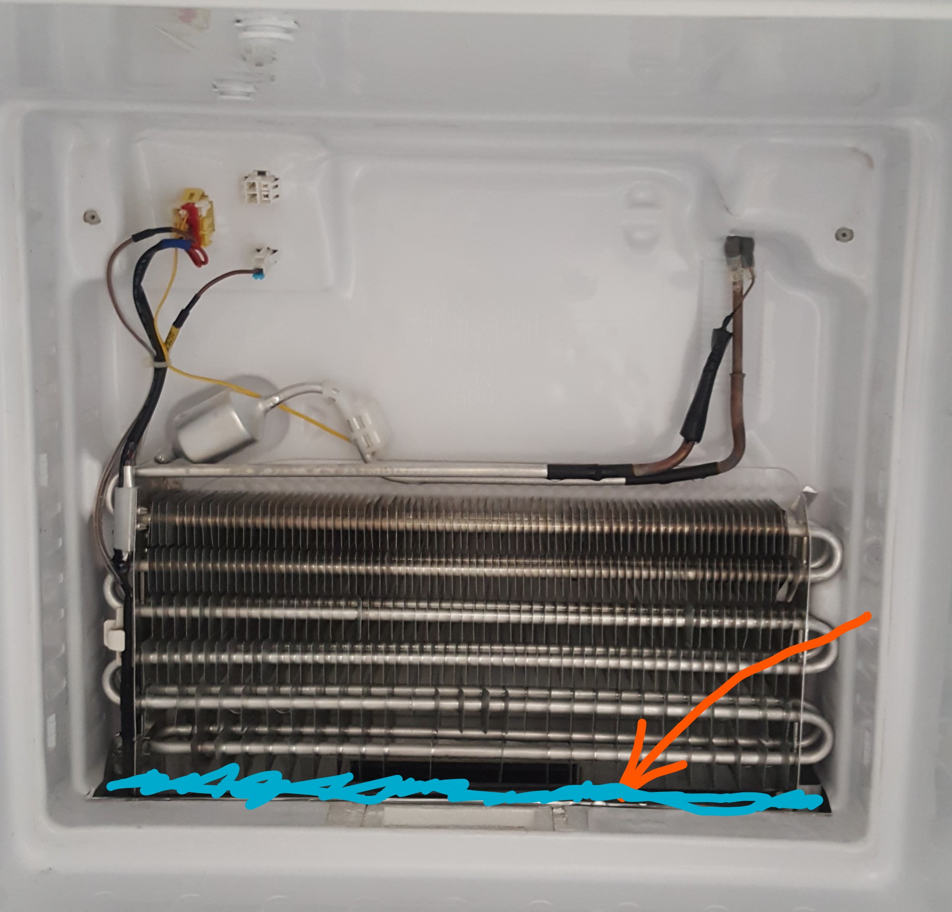 Mavi ile gösterdiğim kısım tamamen buz tutmuştu. Aslında burada birkaç santim derinliğinde bir hazne var. Fazla vaktim olmadığı için burayı saç kurutma ile hızlıca çözdürdüm. Turuncu okla gösterilen noktada haznenin içinde bir delik var. Normalde burada biriken sıvı hortumla alttaki kompresörün üstünde bulunan plastik bir tepsiye dökülüyor. Buradan da kompresörün ısısı ve soğutma sisteminin ısınan boruları sayesinde sıvı buharlaşıyor. Bendeki sorun, neredeyse yukarıdaki delikten itibaren 25cm lik bir mesafede boru içerisindeki su donmuştu. Açılıncaya kadar ılık su takviyesi, çözünen suyu çekme, ılık su takviyesi döngüsüyle, yaklaşık bir saatte tıkanıklığı giderdim. (Hatırlatayım, hortuma kolayca ulaşmak neredeyse imkansız. Arka kapağı bir kaç vida tutuyor. Bunları söktüm ama kapak yerinden oynamadı bile. Bir şekilde arasını köpükle doldurdular herhalde)