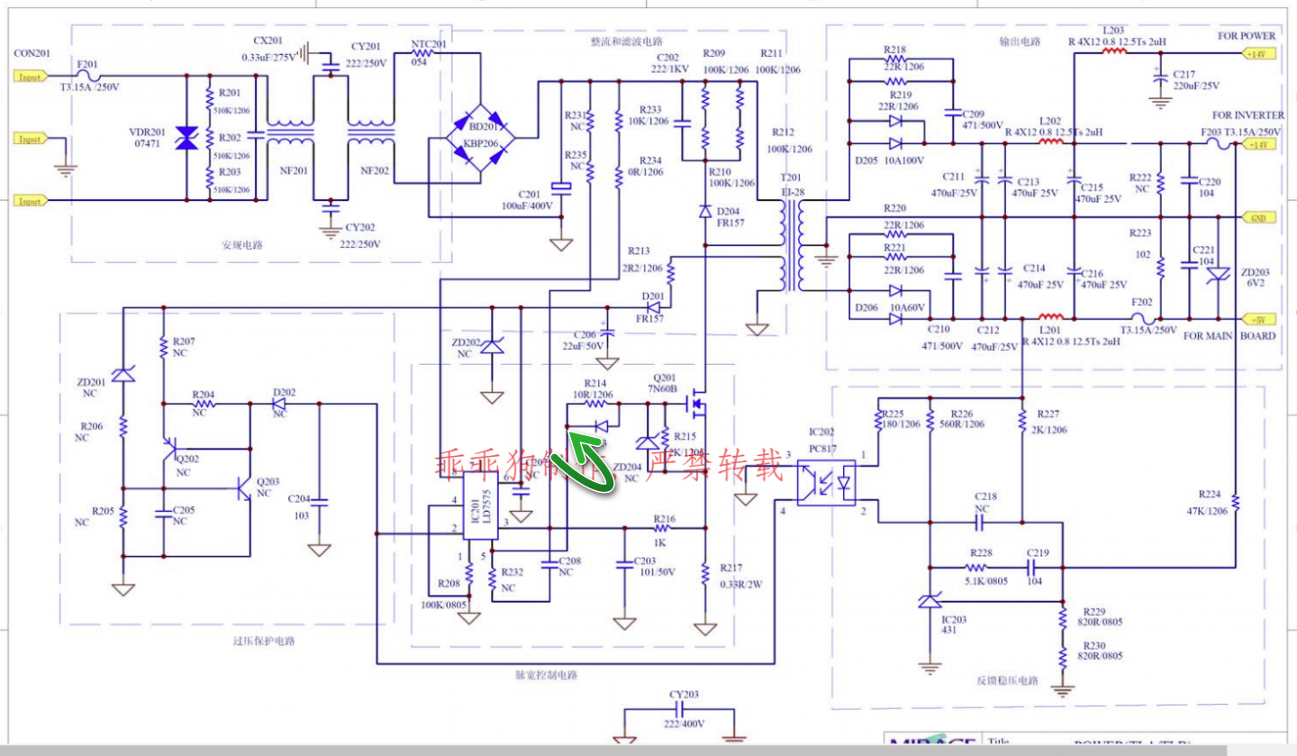 Buradaki sorun zenerin ters takılması. LD7575 5 ci pinden gelen pwm sinyali tamamen gate-source arasını kısa devre ederek mosfeti çalıştırmıyordu. mosfet açılmadığından, optoyu harekete geçirmiyor ve dolayısıyla feedback sinyali olarak LD7575 e dönmüyordu.