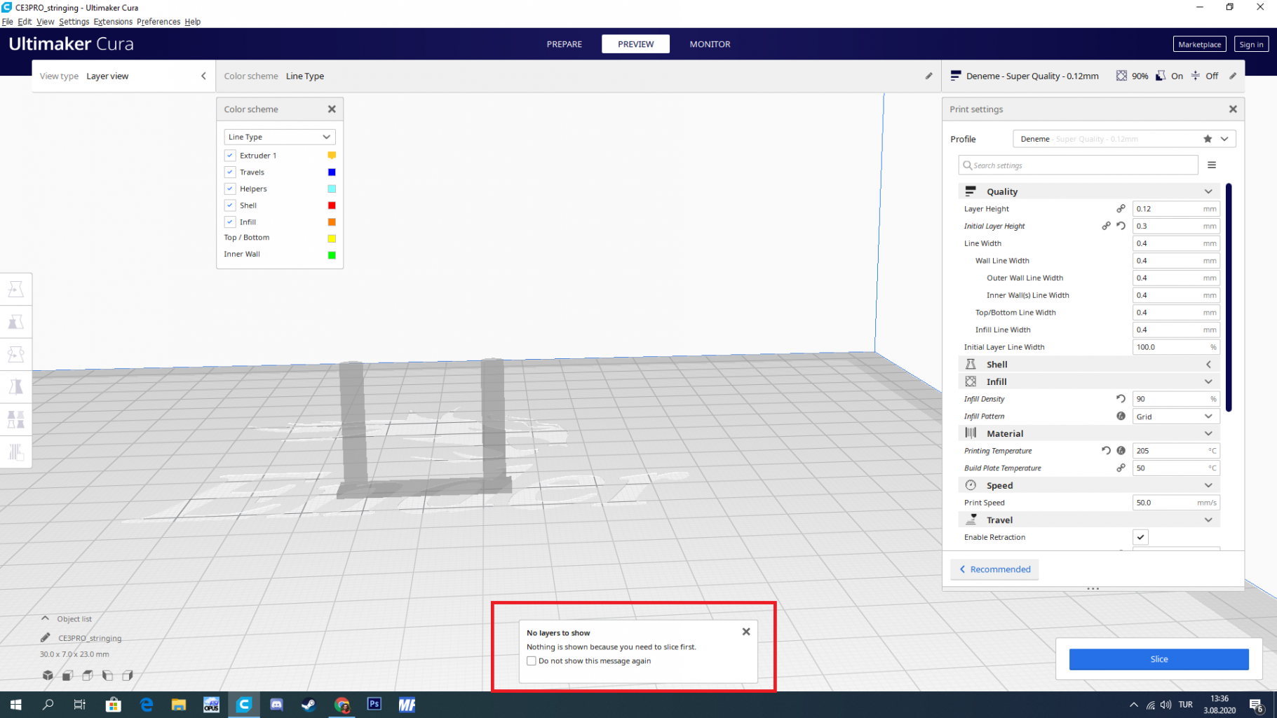 Preview seçeneğinde görüntü alabilmek için sağ alttaki "slice" dilimle seçeneğini yapman gerekir. Dilimlemediğin için görüntüleyecek katman yok diyor