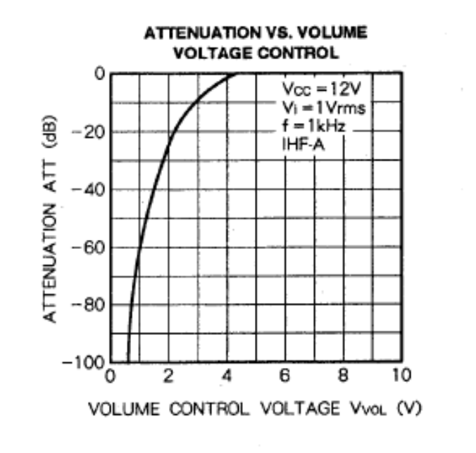 Hmm. Datasheet'e bakınca 2.4V durumunda -20 dB zayıflatma yapıyor volüm kontrol entegresi. Bu durumda iken entegrenin az da olsa bir çıkış veriyor olması lazım. Şu anda entegre çıkışında hiç mi sinyal yok? (1 kHz, 1 Vrms gibi bir test tonu verip çıkışa osiloskop ile bakabilirsin)