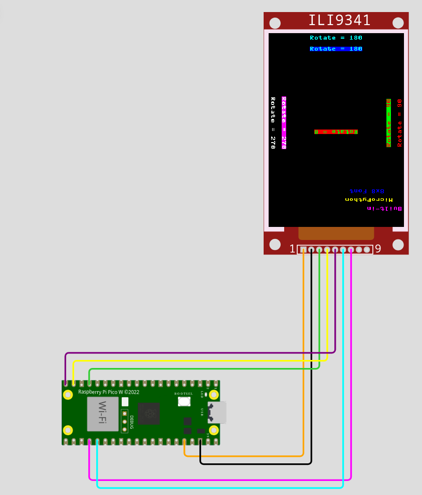 hiç çalışmadı kaç tane ekran kütüphanesi ve main.py bulduysak yükledik hiç çalışmadı internetten baktık örnekleri denedik yok yine olmadı ... ili9341 2.8 İnch SPI TFT Module ekranı ; pi pico 2W nin şu fiziksel pinlerine ,bacaklarına bağladık
