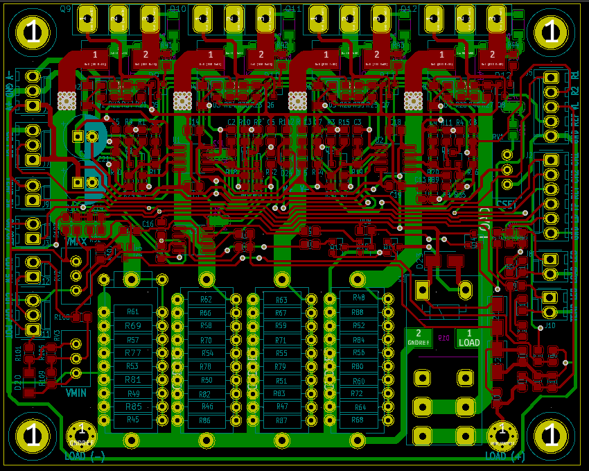 4 girişli harici adc modülleri referans aldım. 2 akım, 1 voltaj, 1 sıcaklık. Ayrıca mosfetleri 1+3 (2+2 opsiyonlu) grupladım. Tek kanal ile 1ma mümkün olacak gibi görünüyor. Altındaki değerler gürültü nedeni ile sıkıntılı olacaktır. Hemde 1ma altını gereksiz gördüm.