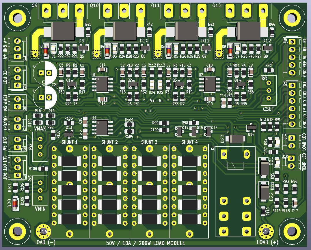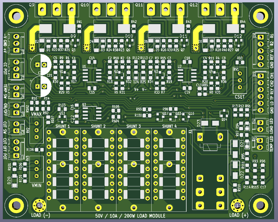 Smd bileşenler ve 2512 şönt seçeneği. 5 er adet te arka yüze takılabiliyor. Böylece Mosfet başına 10 adet paralel bağlanabilir. Şönt alanın ortasında kalan delik ise C tip şönt için.
