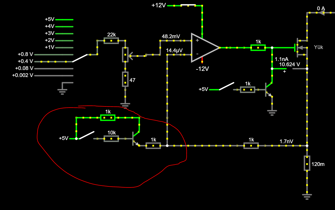 Benim devrede potu 0'a çekince yük bağlı değilken Gate 0V oluyor. Ama dac falan kullanınca yada çok ufak da olsa fark dediğin gibi olacak, ya da offset voltajı negatif olunca değil mi? Bunu önlemek için dediğin gibi Gate'i şağı çekmek gibi bir şey yapmak lazım. Ama gate serbest kaldığında da opamp çıkışı dengeye gelene kadar yine aşırı akım olmaması için yavaş bırakmak lazım.Düzelttim. anahtar ekledim. Sorun anahtar açıkken yani yük bağlı değil iken vgs nin 15v olması...