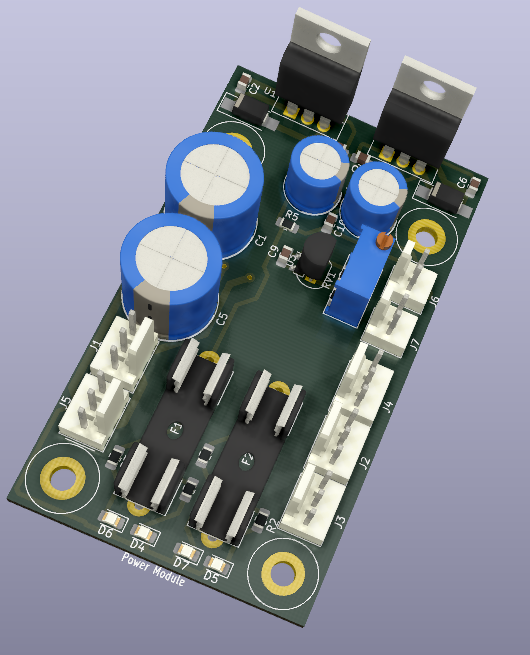 Pcb yi basıp test edeceğim ama elimde simetrik güç kaynağı yok. Bu nedenle besleme modulunude hazırlayıp ikisinin pcb sini aynı anda yapmaya karar verdim. Henüz son şeklini almadı ancak biraz yol aldım. Besleme modülü yine 40x70mm ebatlarında ve aynı koordinatlardaki montaj deliklerine sahip olacak. 78xx ve 79xx serisine göre bir tasarım yaptım. Ayrıca ister sabit direnç ile ister trimpot ile ayarlı kullanılabilecek bir TL431 i de araya sıkıştırdım. Aslında bu besleme modülüne 5v da eklemiştim ama sonradan aklıma 3v3 de gelince vazgeçtim. Yine fan gibi muhtelif diğer donanımlarında 12V besleme ihtiyacı olabilir. Hem tüm isteklerin bu modül üzerine sığmaması hemde simetrik beslemeye asimetrik yüklenmemek için ikinci bir modül daha yapmaya karar verim. işin o kısmını biraz ilerlettim. O kart üzerinde iki adet LM317T ve yine TL431 olacak. LM317 nin biri 3.3V veya 5V için kullanılır iken diğeri 12V gibi ihtiyaçlar için kullanılacak. Modüllerin mümkün mertebe diğer projelerde de kullanılabilir olmasını hedefliyorum.