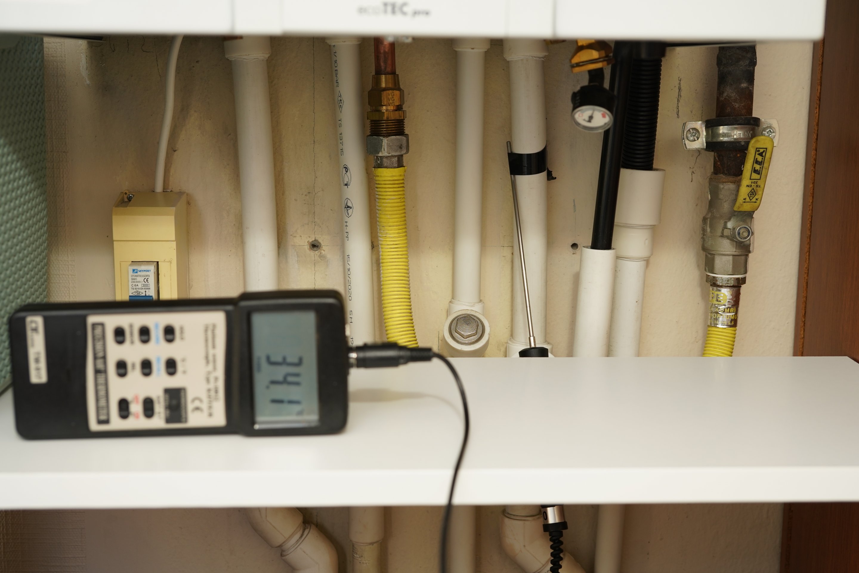 Bir termometreyi bu sıcak su gidiş borusuna bağlayıp kombi çalışırken maksimum kaç dereceye çıktığını ölçebilir misin?