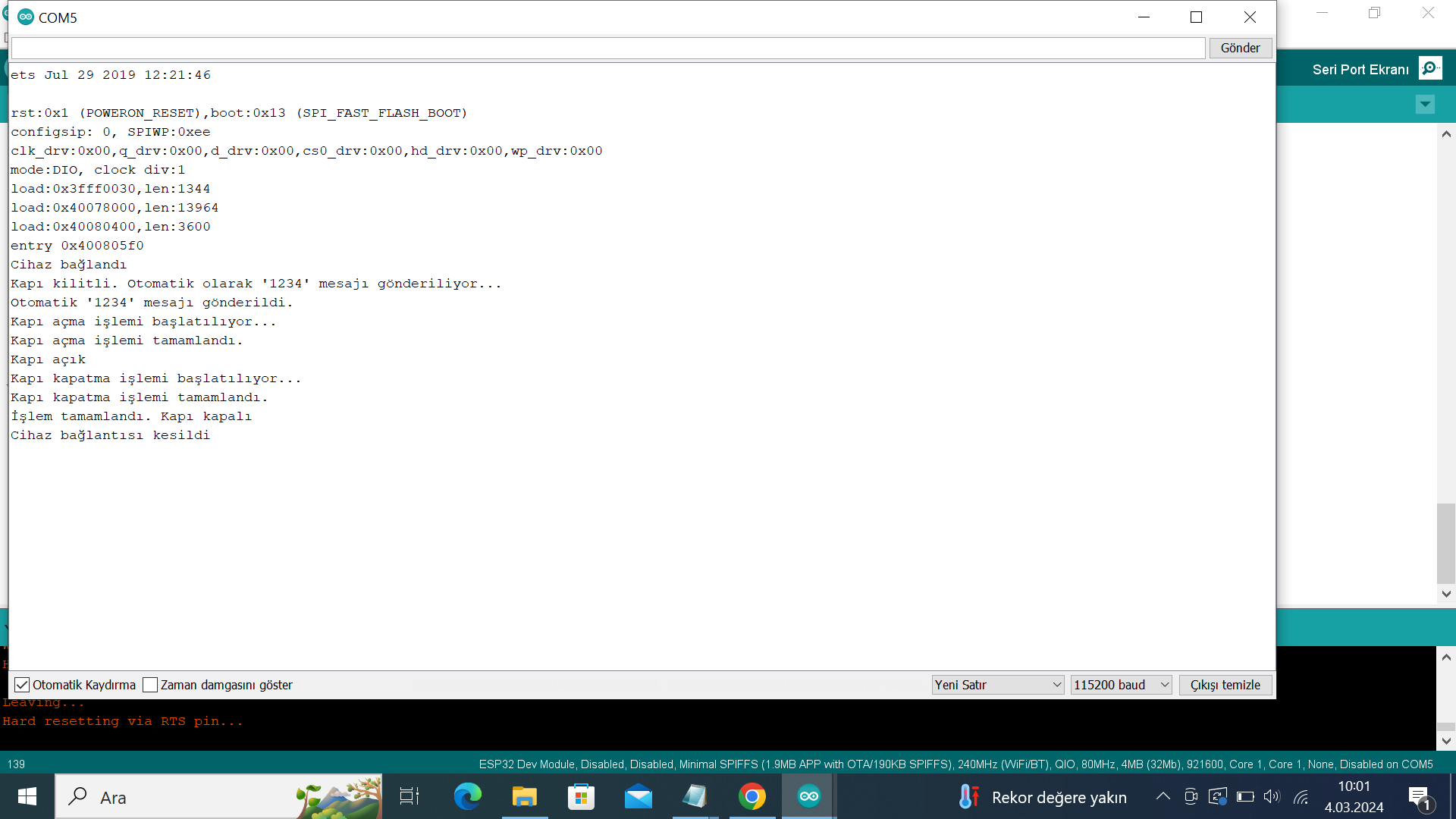 Serial.println("Kapı kilitli. Otomatik olarak '1234' mesajı gönderiliyor...");
