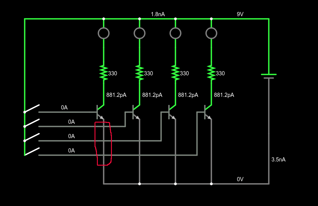 Merhaba arkadaşlar. Proteusta çizilmiş bir devreyi falstadta çizeyim dedim ama devre yanlış çalışıyor. Proteus devresini ve falstad linkini aşağıya ekledim. Normalde her switch ayrı bir ledi yakarken burada tek switch kapanınca hepsi yanıyor. Nerede hata yaptım acaba?
