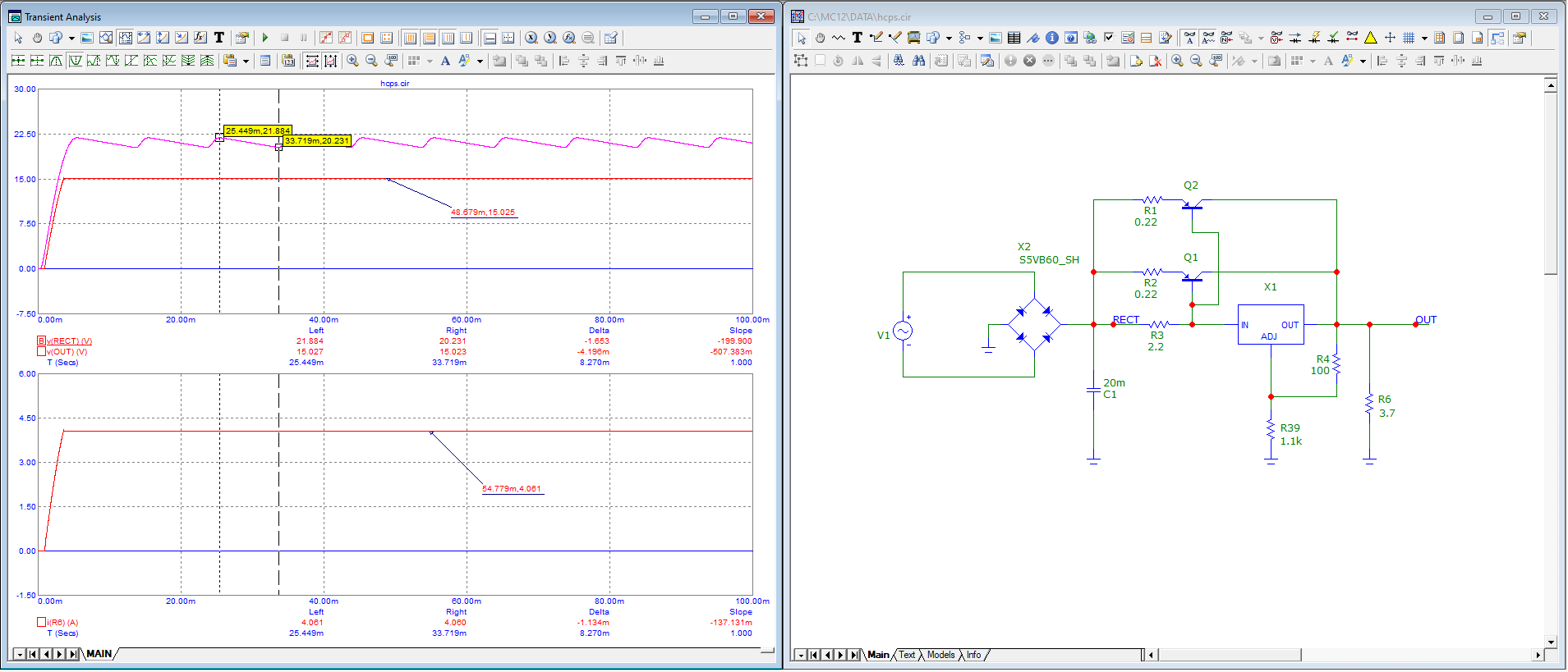 4 A akım için 1000 µF çok az geliyor ve bir sonraki 100 Hz döngüsü gelmeden kondansatör 15 V un altına iniyor. Grafikten net anlaşılmaz ama kabaca 14 Vpp ripple var :D F8 cursor mode kullanarak tam olarak minimum maksimum noktaları belirleyip aradaki farktan net ripple değerini görebilirsin.