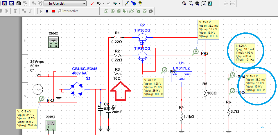 Devre simülatörde çalıştı .Tam olarak 4 amper çekebiliyorsun.Tek problem LM317 nin girişine bağlanan 2,2 Ohm luk direnci 10 ohm yapınca transistörler iletime geçti.Sanırım o transistörün kazancıyla ilgili bir formülüne göre hesaplanıyordu.