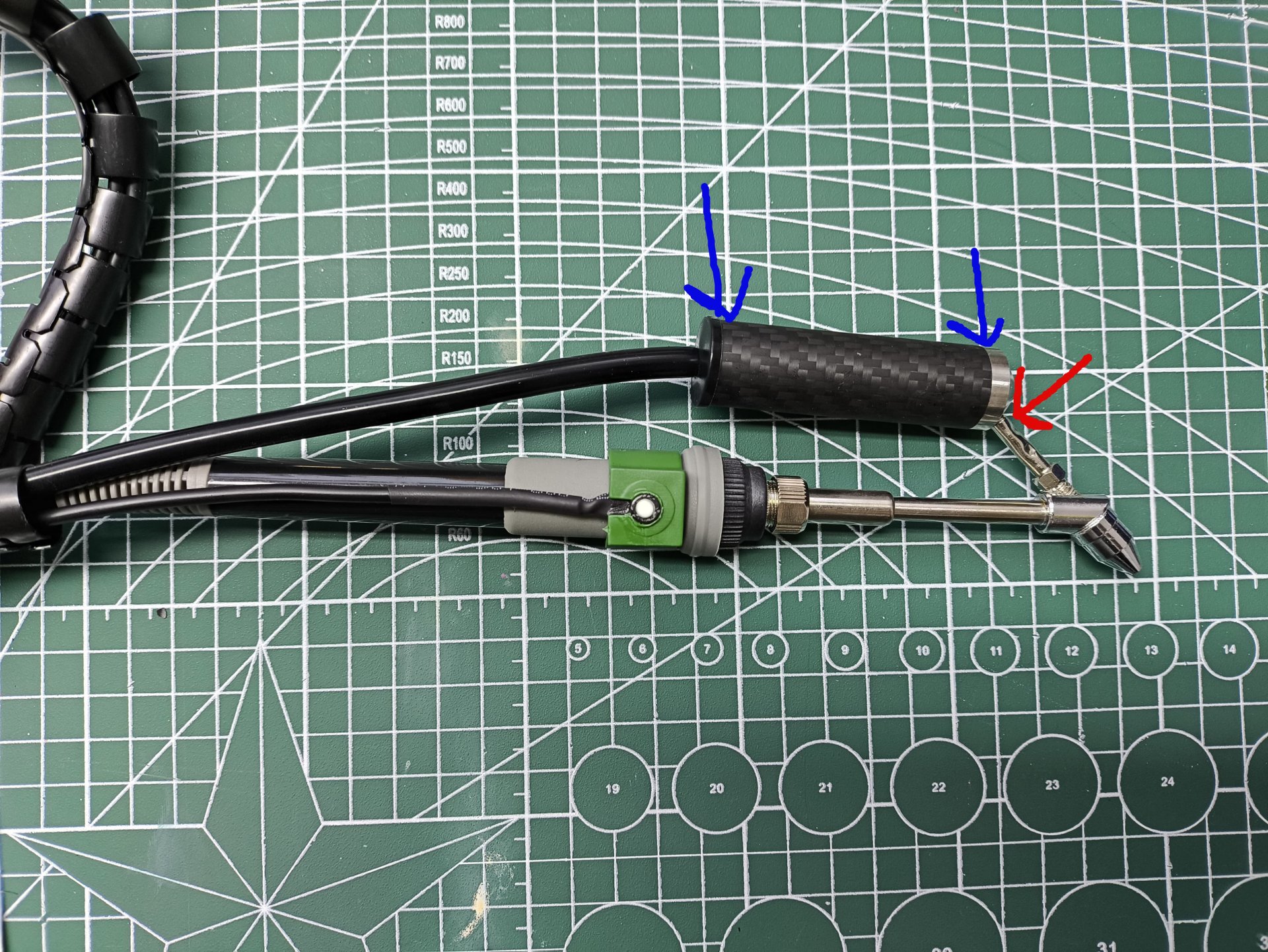 Havya kolu T12'den alışık olduğumuz bir kol kol üzerindeki ısıtıcı uç yerinden çıkartılabiliyor ısıtıcı uç 7.2 Ω (80W) üzerindeki buton vakum pompasını çalıştırıyor (NO olarak çalışıyor basıldığı zaman devreye giriyor) buton boru kelepçesine benzeyen yeşil bir parça ile sapa geçirilmiş saptan çıkartılıp yerine JBC ve Weller de gördüğüm ayak pedalı ile vakum pompası kullanılabilir ileride bu modifikasyonu yapacağım havya üzerindeki siyah lehimlerin toplandığı rezarvuar camdan üretilmemiş yihua ve class da olduğu gibi kırılma derdi olmaz metal yada plastiğe benzer yapısı var