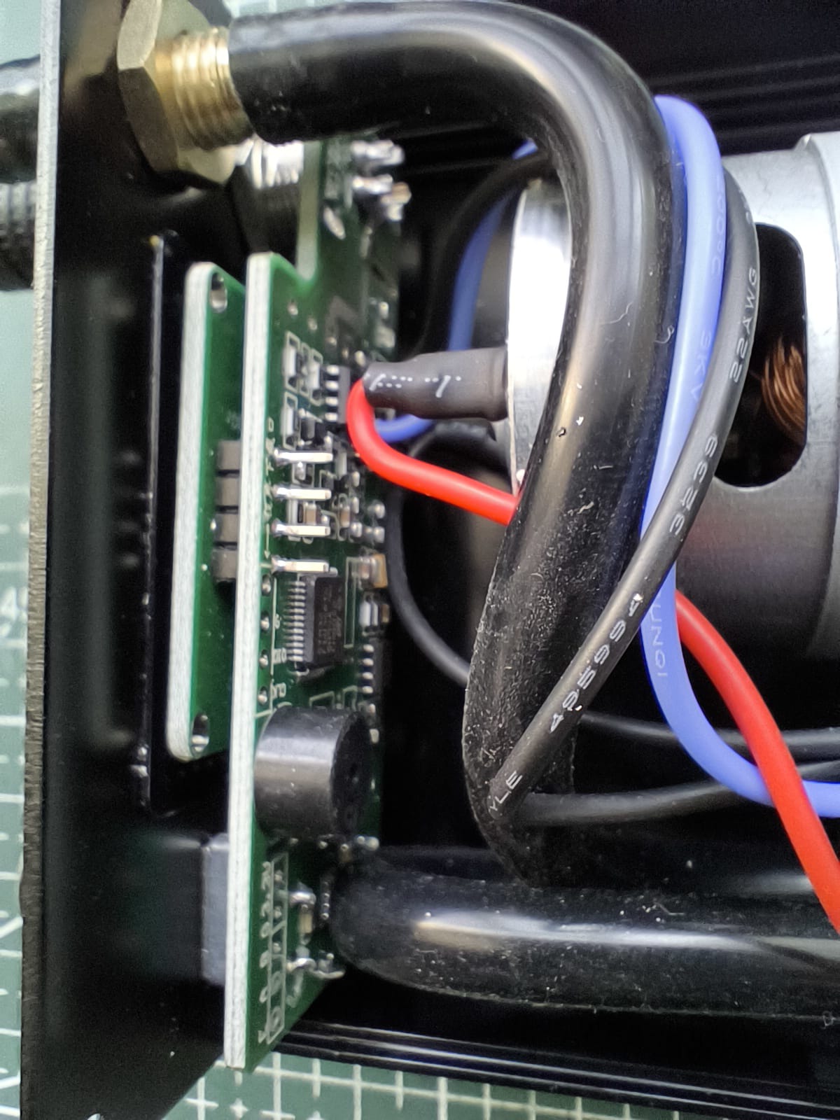 Motor girişine bağlanan kart XL4015 5A DC-DC düşürücü, motora giden voltaj 23,80 V olarak ayarlanmış