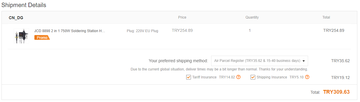 Vergi dahil seçeneği ile vergisiz sigortalı seçenek arasında 40 TL fiyat farkı var. Bence vergi sigortası yerine vergi dahil al. İlla ki bir miktar vergi ödeyeceksin. Kargo süresi olarak da süre çok fark edebiliyor.