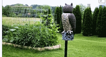 Ön tenteme uçan kuşlarla, ışığımın üzerinde oturan, sıçrayan ve yuva kurmaya çalışan kuşlarla ilgili büyük bir sorun yaşadım. Her gün postayı almaya gittiğimde, paspasımın her tarafında kuş topakları, ince dallar ve çimen görmek zorunda kaldım. Baykuş Frank ile tanışın. Dönen kafası olan bir canavar. Komşularınız ondan biraz korkacak; Frank, göz alıcı bir ilgi fahişesi. Estetik çekiciliği dışında en sevdiğim yanı kuşların gitmiş olması. Sekiz metrelik bir bahçe sopasına Frank fırlattım ve o zamandan beri ön bölgemde bir kuş veya sincap görmedim. Artık kuş pisliği ve yuva yok! Sadece dört gün olduğunun farkındayım, bu yüzden kuşlar Frank'e alışırsa bunu güncelleyeceğim, ama şimdiye kadar çok iyi. Hayat endişesizdir.