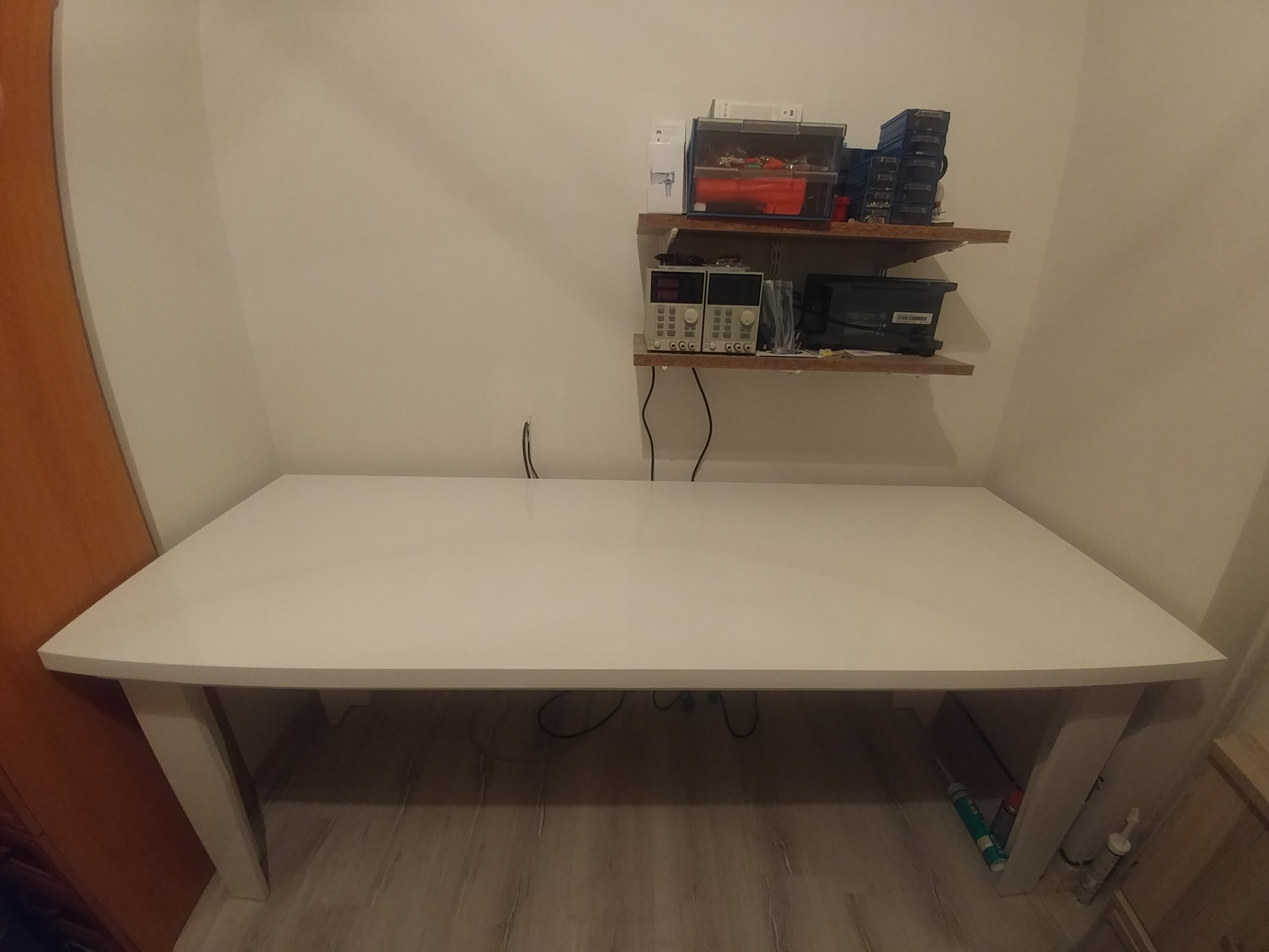 İlave olarak masanın genişliğinde 195x30 cm 3 adet mdf raf yaptırdım, en alt rafa koyacağım osiloskop vs gibi ekipmanlar göz hizasında olacak. Her raf için duvara monte için 4 er adet raf tutucu takacağım.