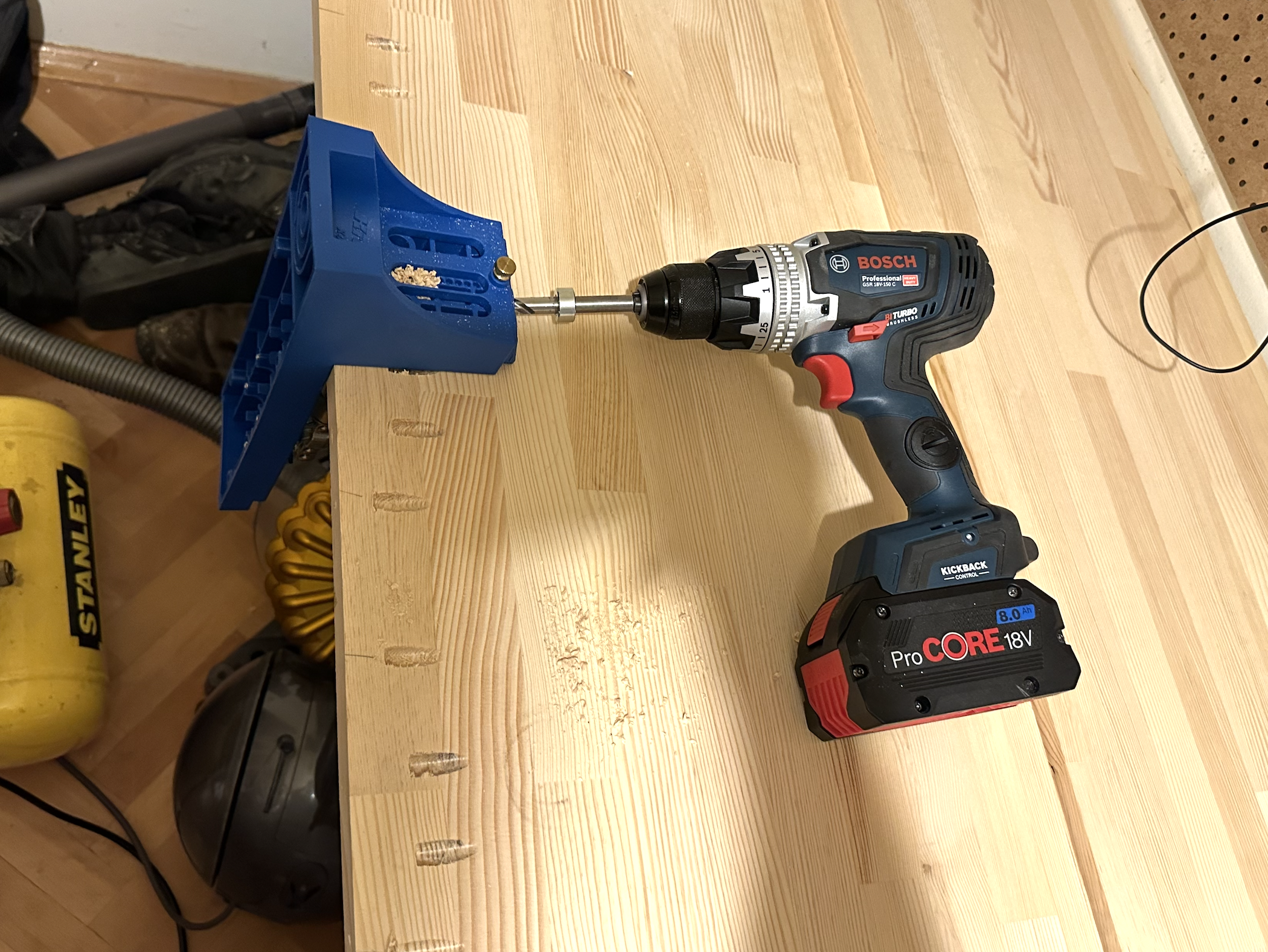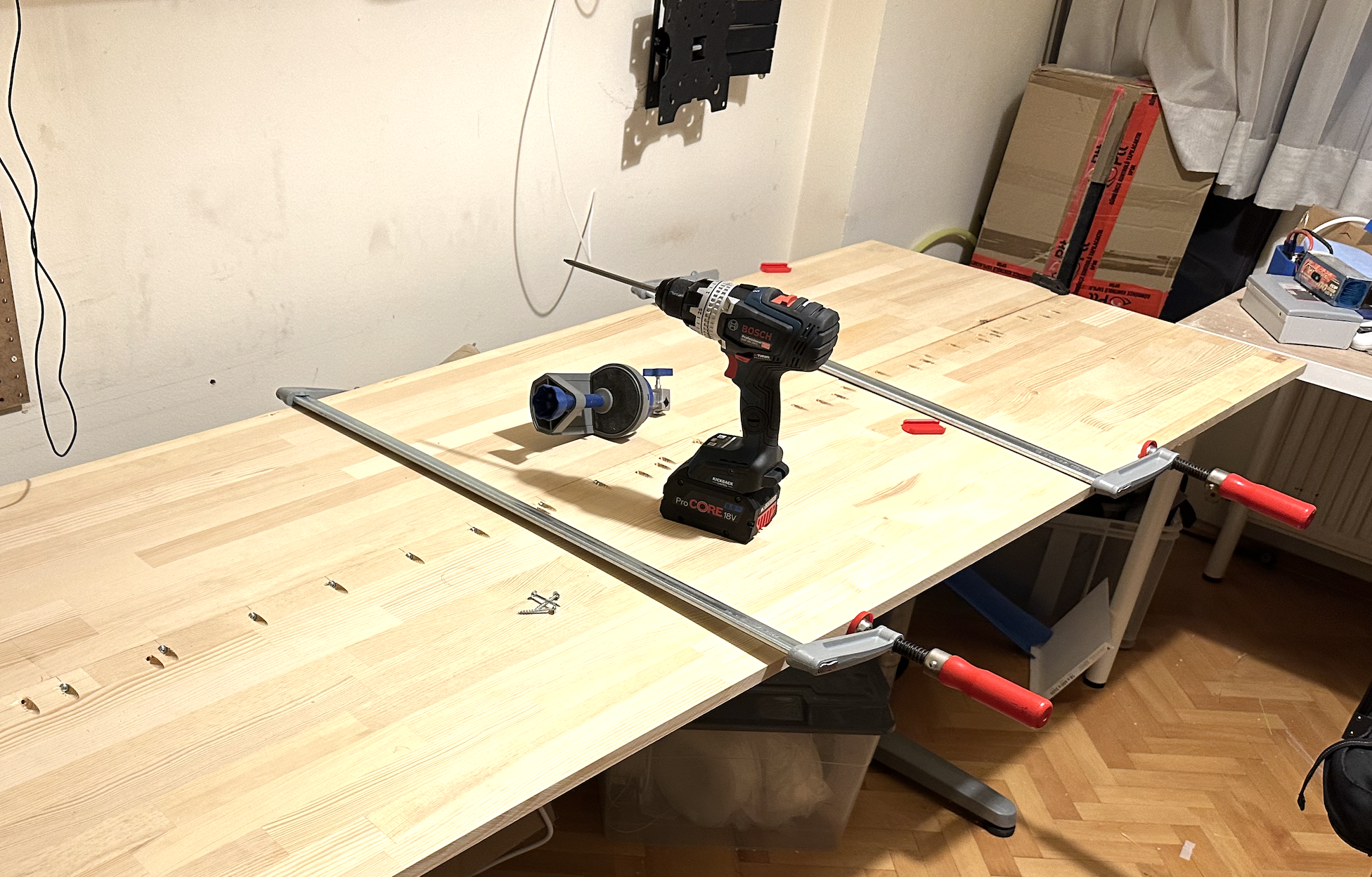 Birlestirmek icin Kreg ile delikleri actim. 135kg olmusum, yere oturup kalkmak olimpik aktivite gibi oldu bana. Herseyi kendi basima yaptigim gunler geride kalmis :(