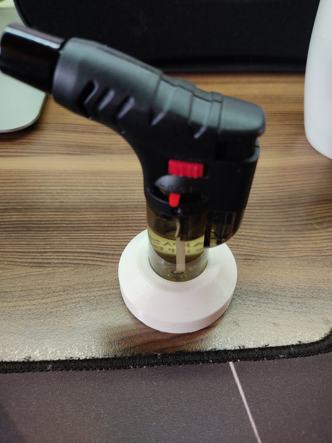 Bir de şu pürmüz var. Bunun gibi bir şey çok gerekiyor. Marakoron daraltırken ya da bir karışımı ısıtırken filan elimizin alında olmasında yarar var. Bunun tabanı küçük olduğu için 3D yazıcıdan daha sağlam durmasını sağlayacak aparat yazdırmam gerekiyor. Bu şekilde duryor ama gazı açıp kilitlediğimizde dik duracağından emin olmak lazım. Güvenlik için çok önemli.