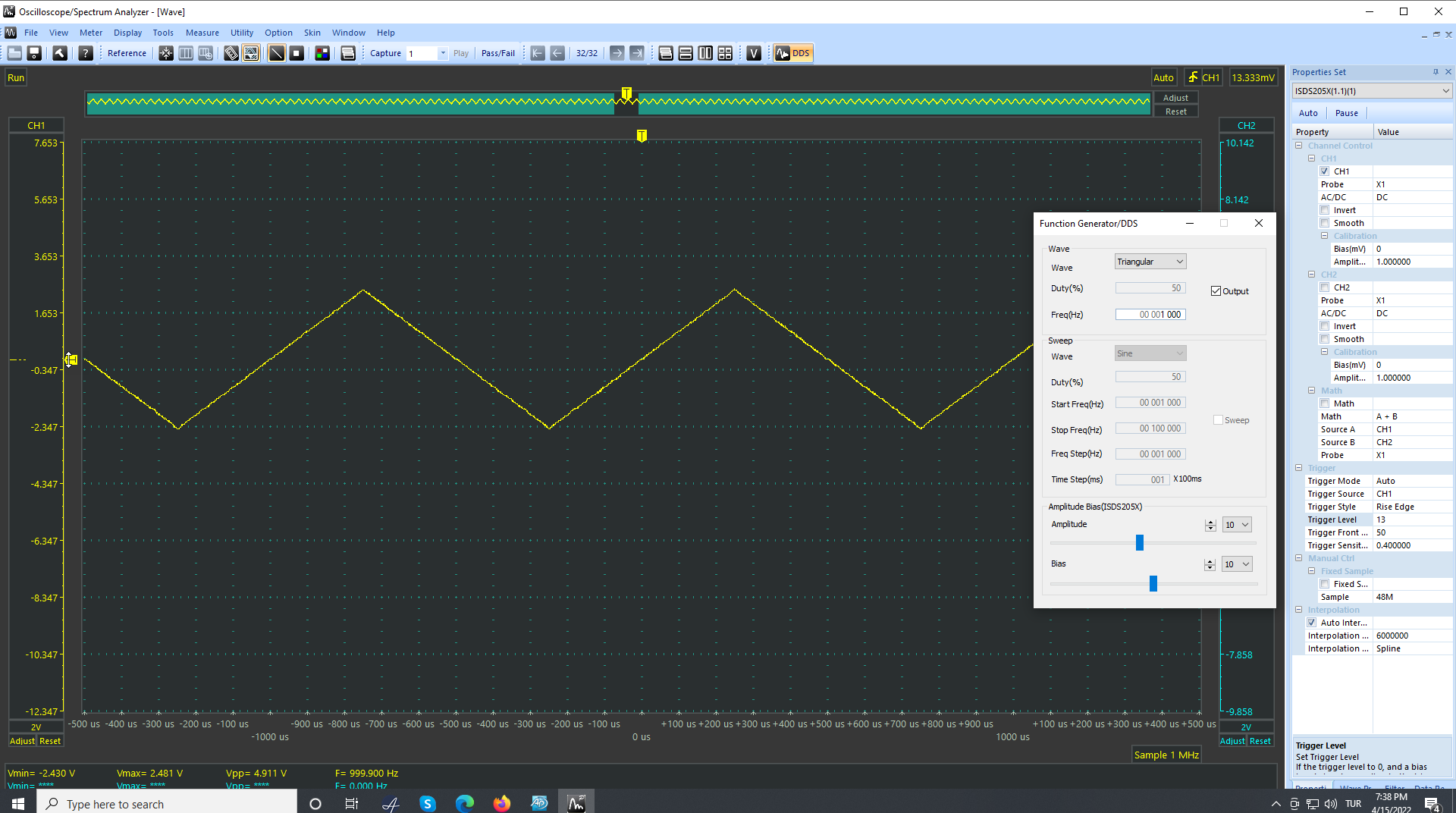 Şimdi de üçgen dalgaya geç. Sonra da solda içinde yan yatmış T olan sarı trigger sürgüsünü yukarı aşağı sürükleyerek trigger level olayını ne yaptığını gör. Yukarıda ortadaki T, trigger'in meydana geldiği yeri gösteriyor. Sen trigger level'i değiştirdikçe üçgenin neresinde trigger olduğunu değiştiriyorsun.