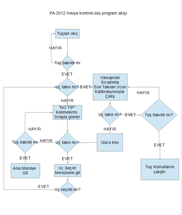 Havya kontrolcüsüne isim verdim: PA-2012 oldu. Saçma ve alakasız bir anlamı var. Program akışı ve arayüz için bir çizelge karaladım. Bu olmadan kalkıştığım işler hep sıkıntılı ilerledi. "Başla" çerçevesini koymamışım, olsun, tepeden başlıyor :) ...