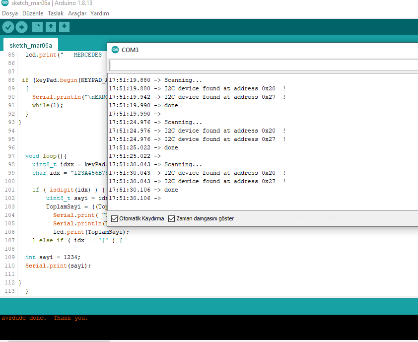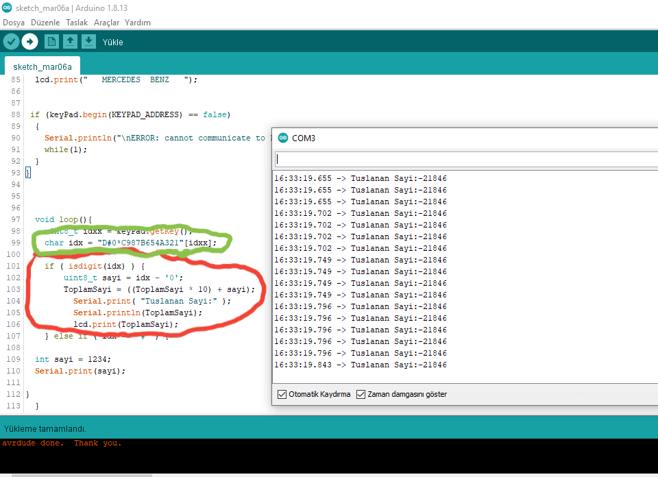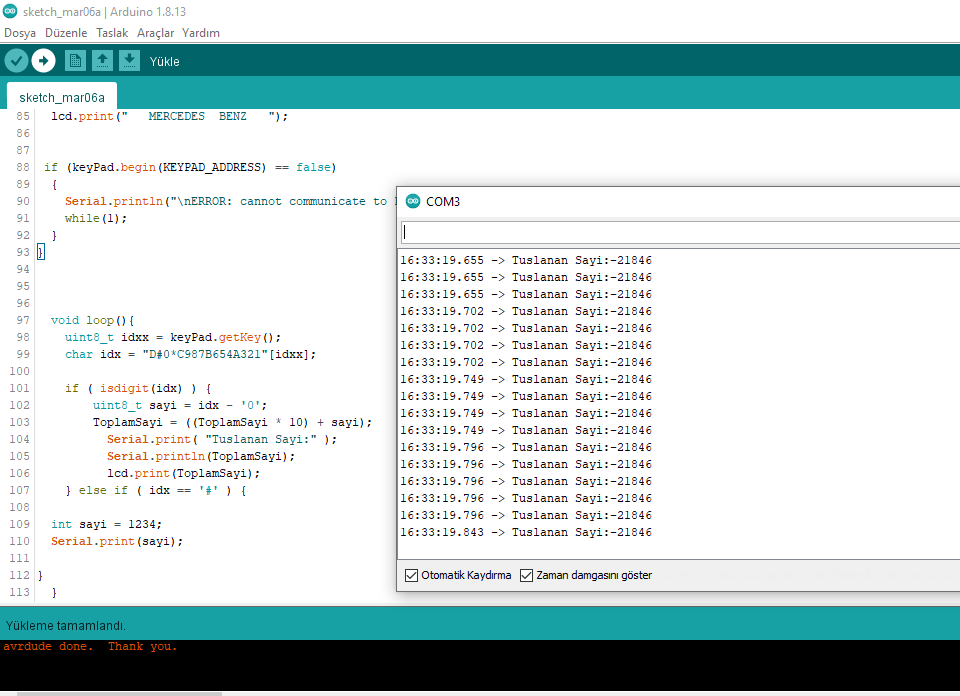 Yaz. toplam değişkenin adına dikkat et. Büyün - küçük harf duyarlıdır. Ben ezbere yazıyorum. Sen oradaki in aynısını yaz. Bunu yaptıktan sonra keypad den 1 e bas ve peşinden # ye bas. Böylece serial monitör de 1 rakamını görmen gerekir. Her rakam girip # ye bastığında girdiğin rakamı serial monitörde okumalısın. Rakamları da bu şekilde test et. Eğer 1'e basıp, monitörde 2 okuyorsan yukarıdaki kodlama da 1 yazan yere 2 yazarak düzelt.