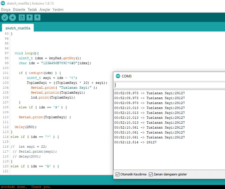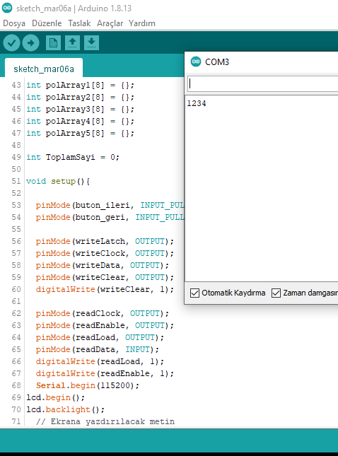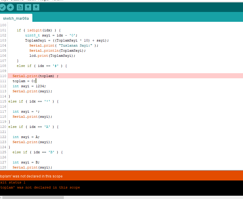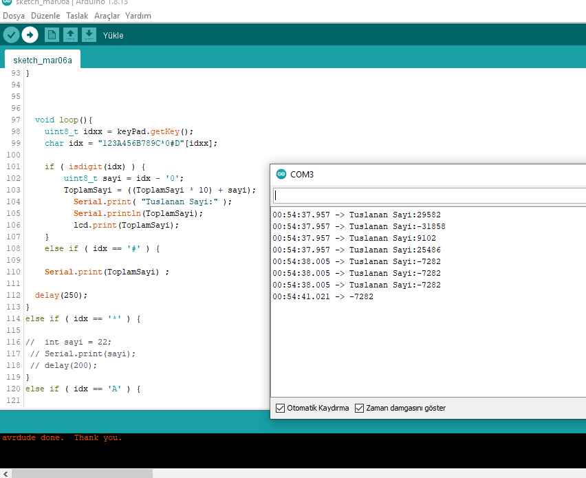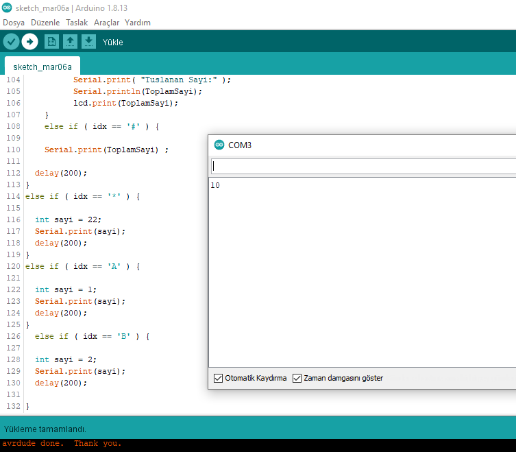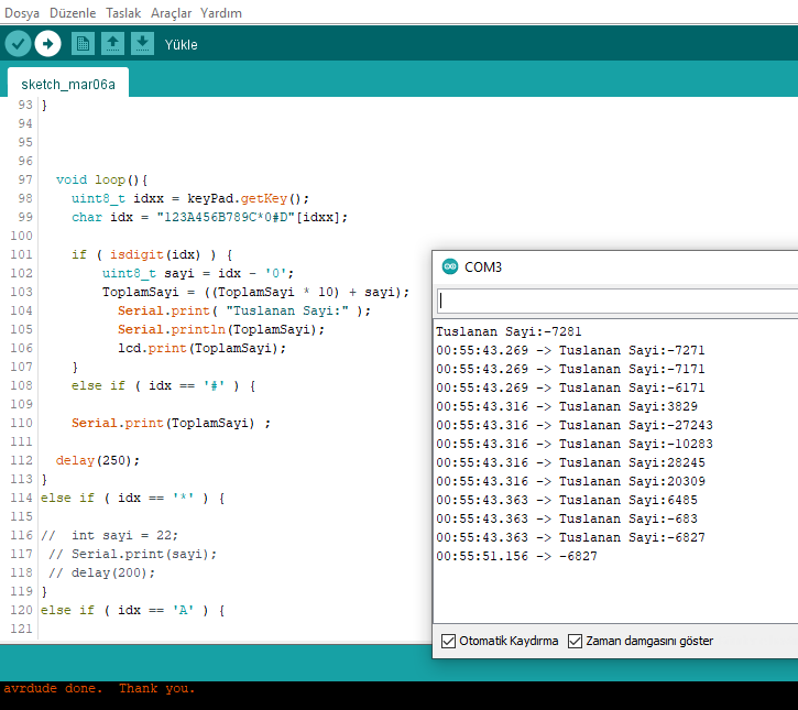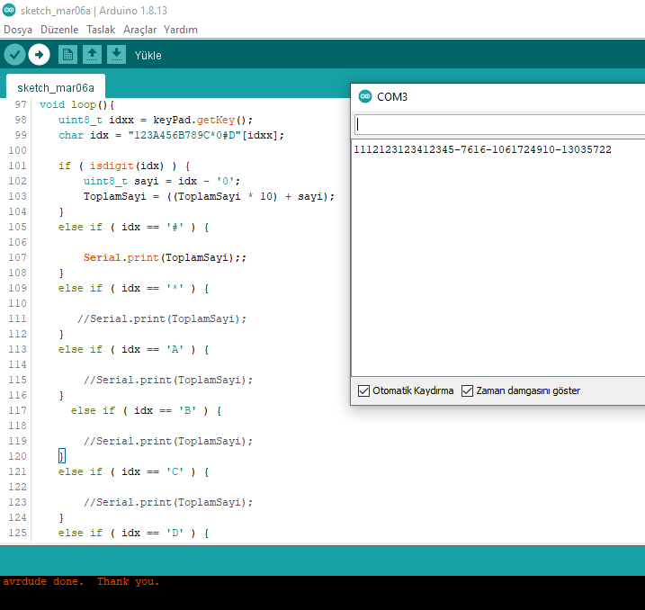 Yaz. toplam değişkenin adına dikkat et. Büyün - küçük harf duyarlıdır. Ben ezbere yazıyorum. Sen oradaki in aynısını yaz. Bunu yaptıktan sonra keypad den 1 e bas ve peşinden # ye bas. Böylece serial monitör de 1 rakamını görmen gerekir. Her rakam girip # ye bastığında girdiğin rakamı serial monitörde okumalısın. Rakamları da bu şekilde test et. Eğer 1'e basıp, monitörde 2 okuyorsan yukarıdaki kodlama da 1 yazan yere 2 yazarak düzelt.