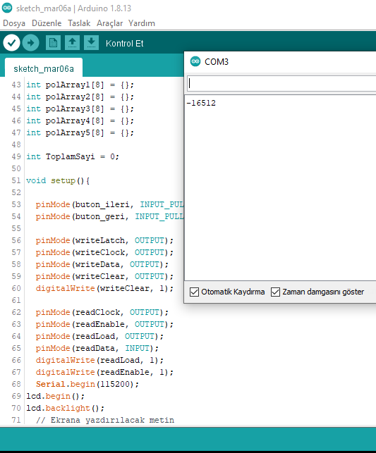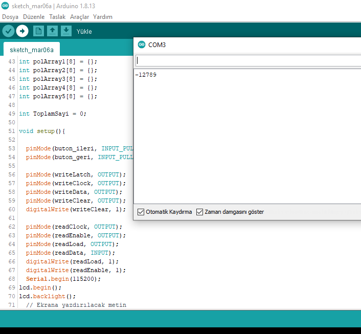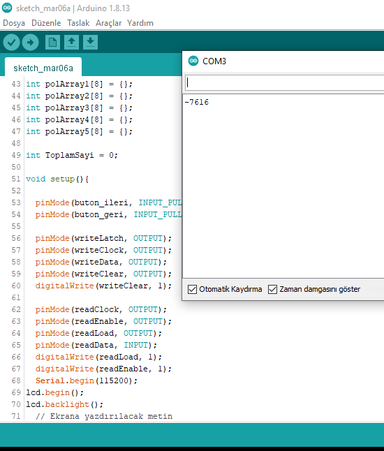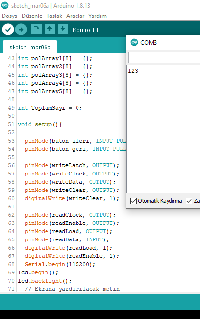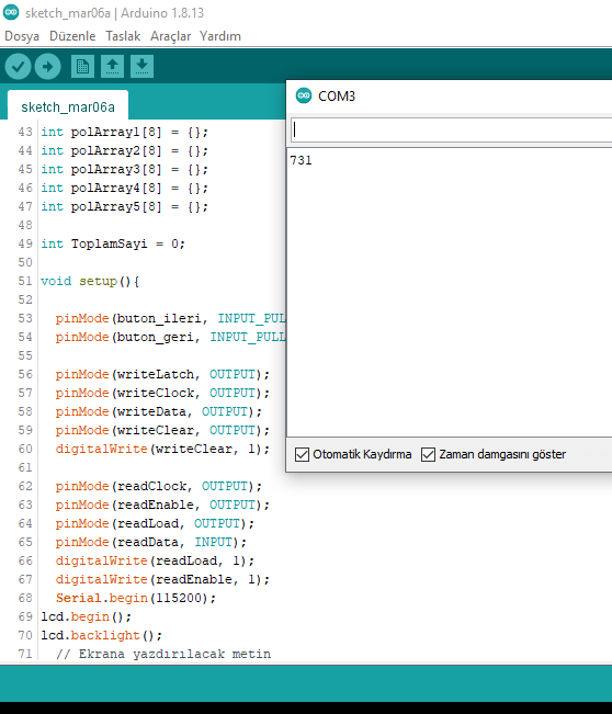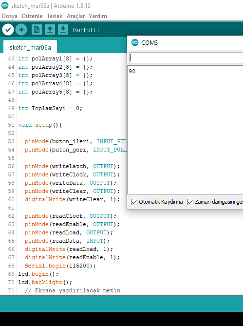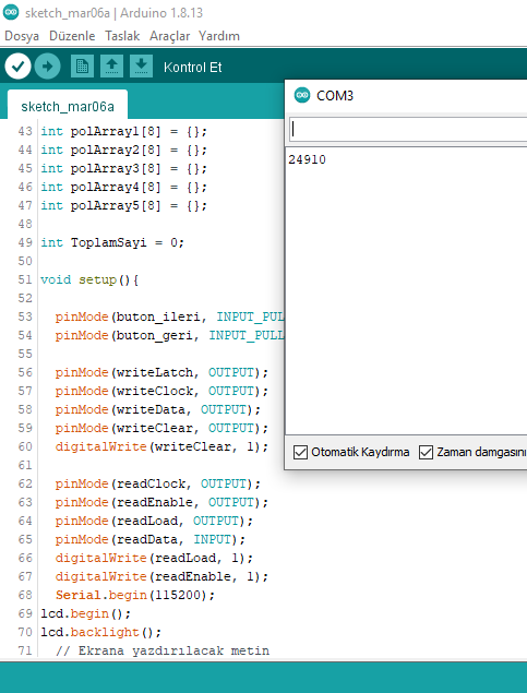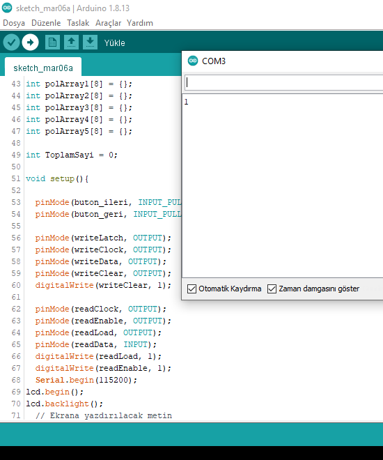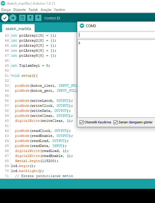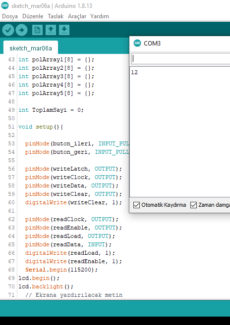 Yaz. toplam değişkenin adına dikkat et. Büyün - küçük harf duyarlıdır. Ben ezbere yazıyorum. Sen oradaki in aynısını yaz. Bunu yaptıktan sonra keypad den 1 e bas ve peşinden # ye bas. Böylece serial monitör de 1 rakamını görmen gerekir. Her rakam girip # ye bastığında girdiğin rakamı serial monitörde okumalısın. Rakamları da bu şekilde test et. Eğer 1'e basıp, monitörde 2 okuyorsan yukarıdaki kodlama da 1 yazan yere 2 yazarak düzelt.