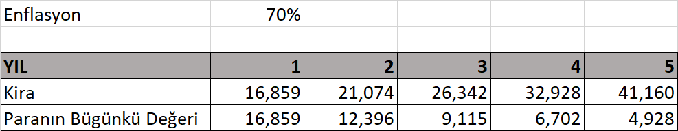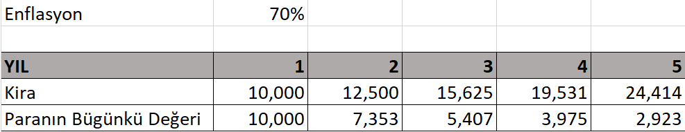 Evini 10 bin liradan kiraya verse, bir sonraki yıl 12500 yapacak. Ancak %70 enflasyondan dolayı o 12500 TL bugünün 7352,94 lirası değerinde olacak.
