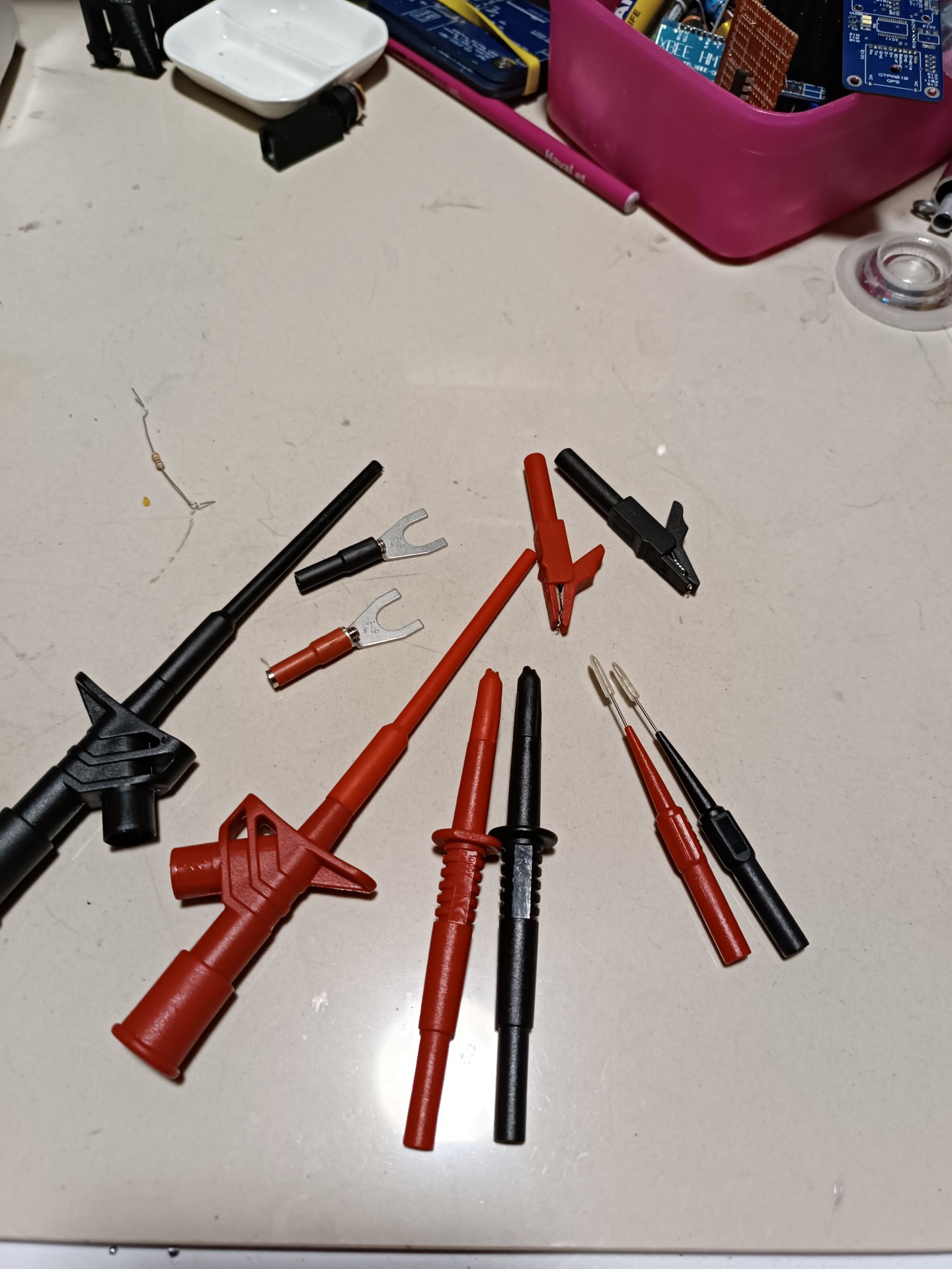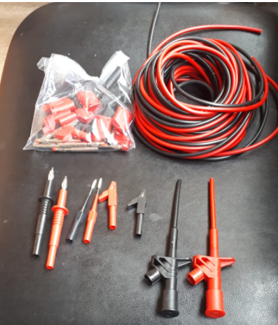 iki kanca, iki iğne, iki prob ucu, iki krokodil, 5+5 born + 8mt kırmızı + 8mt siyah kablo toplam 520TL + Kargo.