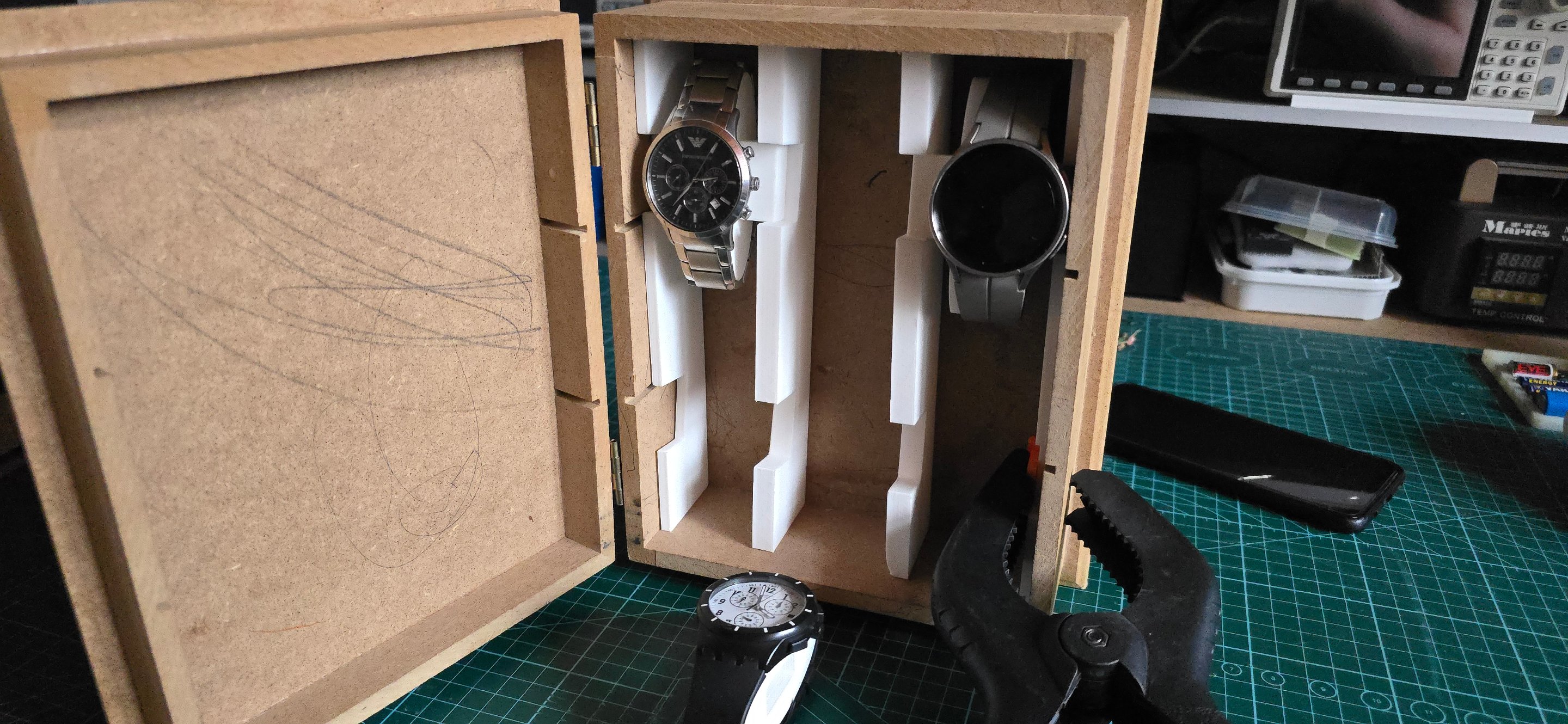 Orası için bir raf tasarladım ve tek parça olarak bastım. Saat gövdelerinin kutu dışına taşmasını hesaba katmak zorunda olduğum için tasarım asimetrik oldu ama oldukça işlevsel.