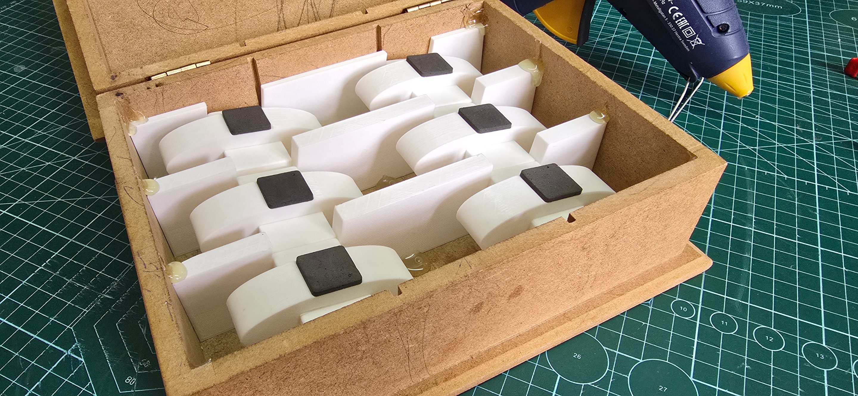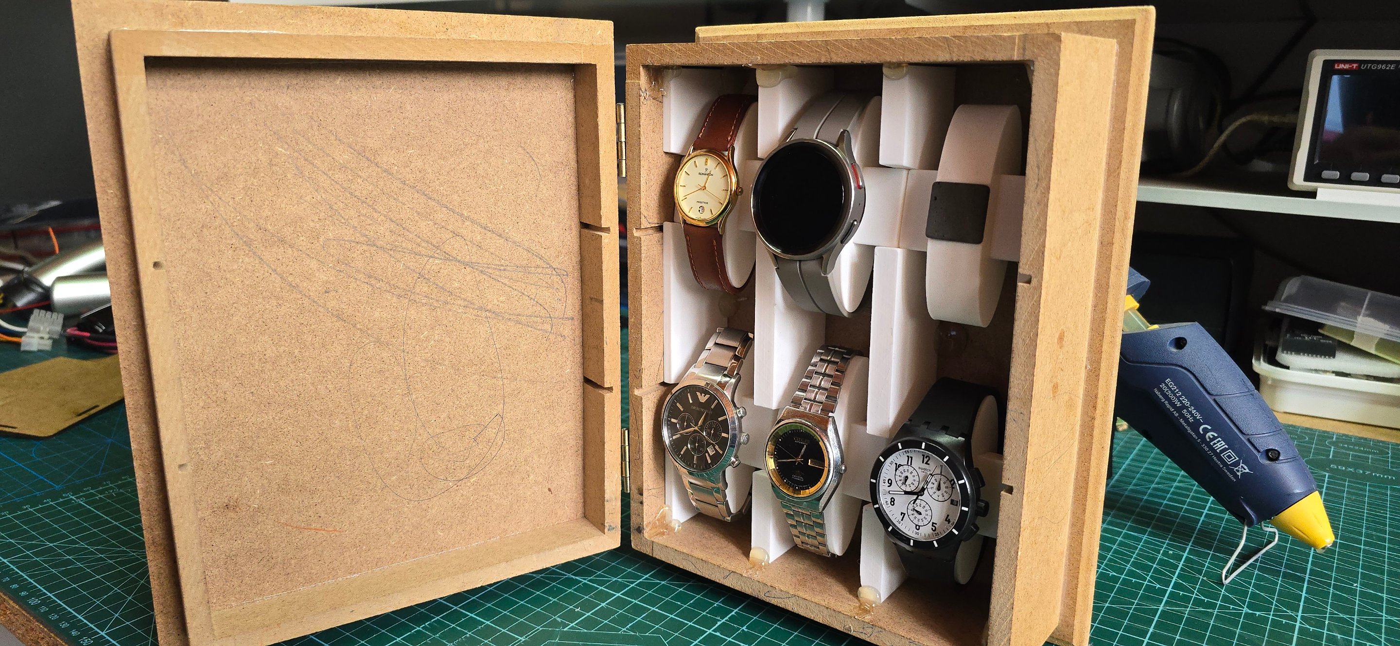 Kutunun içi tamamlandı. Yazıcım müsait olsaydı, iç kısmını tamamen bir parça olarak basıp, orta rafların birbirini desteklemesini sağlardım. Bu haliyle de ikiye bölebilirdim, ama çok zaman alıyor. Bende kutuyu boyamayı planladığım için şimdilik sıcak silikonla tutturdum. Kullanımı kolay ve dik konumda bile saatleri sağlam bir şekilde tutuyor.